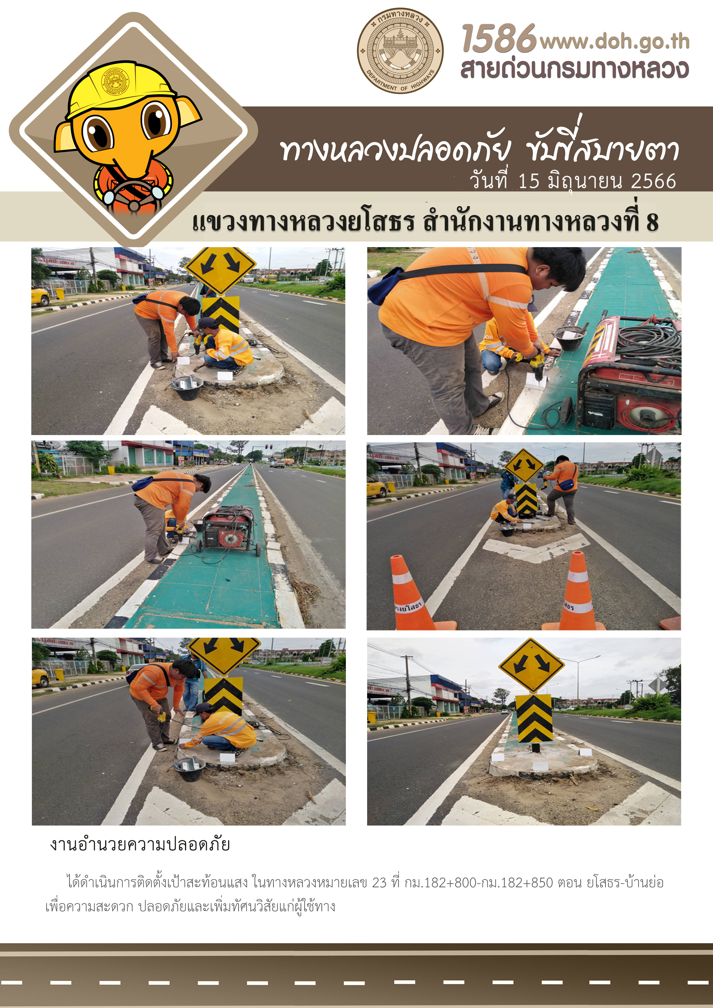 วันที่ 15 มิถุนายน 2566 งานอำนวยความปลอดภัย ได้ดำเนินการติดตั้งเป้าสะท้อนแสง ในทางหลวงหมายเลข 23 ที่ กม.182+800 - กม.182+850 ตอน ยโสธร-บ้านย่อ เพื่อความสะดวก ปลอดภัยและเพิ่มทัศนวิสัยแก่ผู้ใช้ทาง
