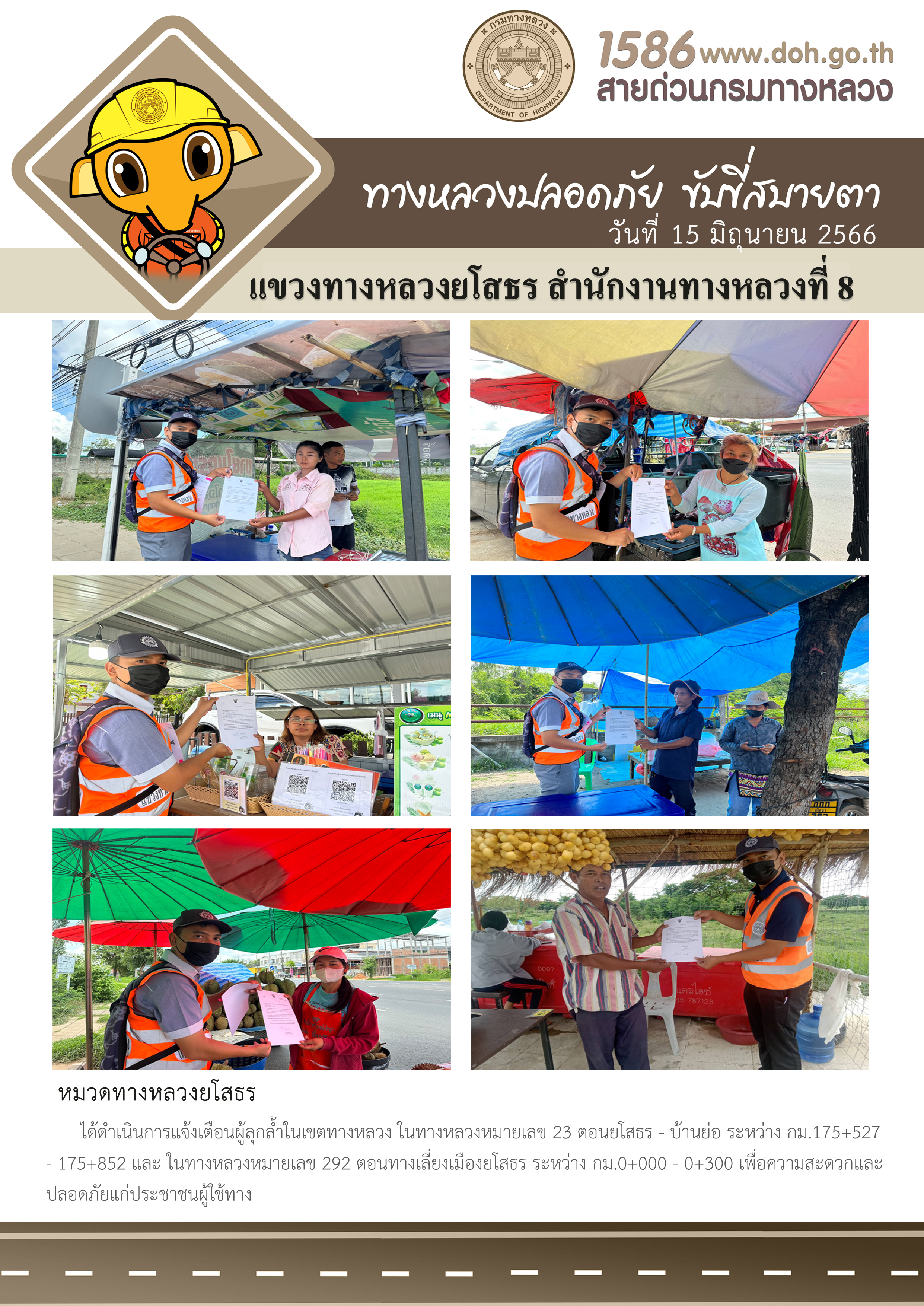 วันที่ 15 มิถุนายน 2566 หมวดทางหลวงยโสธร ได้ดำเนินการแจ้งเตือนผู้รุกล้ำในเขตทางหลวง หมายเลข 23 ตอนยโสธร - บ้านย่อ ระหว่าง กม.175+527 - กม.175+852 และ ในทางหลวงหมายเลข 292 ตอนทางเลี่ยงเมืองยโสธร ระหว่าง กม.0+000 - กม.0+300 เพื่อความสะดวก