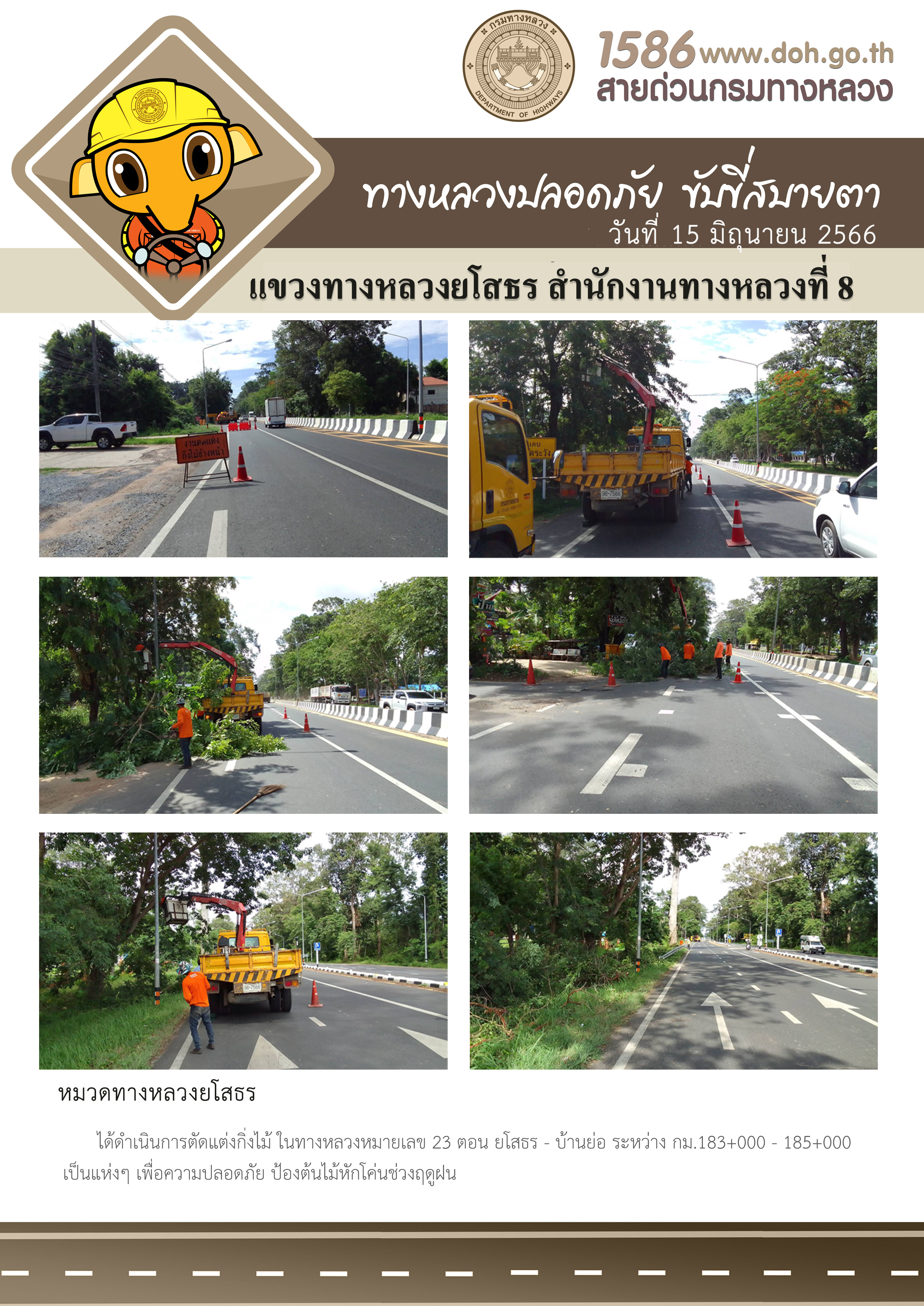 วันที่ 15 มิถุนายน 2566 หมวดทางหลวงยโสธร ได้ดำเนินการตัดแต่งกิ่งไม้ ในทางหลวงหมายเลข 23 ตอน ยโสธร - บ้านย่อ ระหว่าง กม.183+000 - กม.185+000 เป็นแห่งๆ เพื่อความปลอดภัย และป้องกันต้นไม้หักโค่นช่วงฤดูฝน