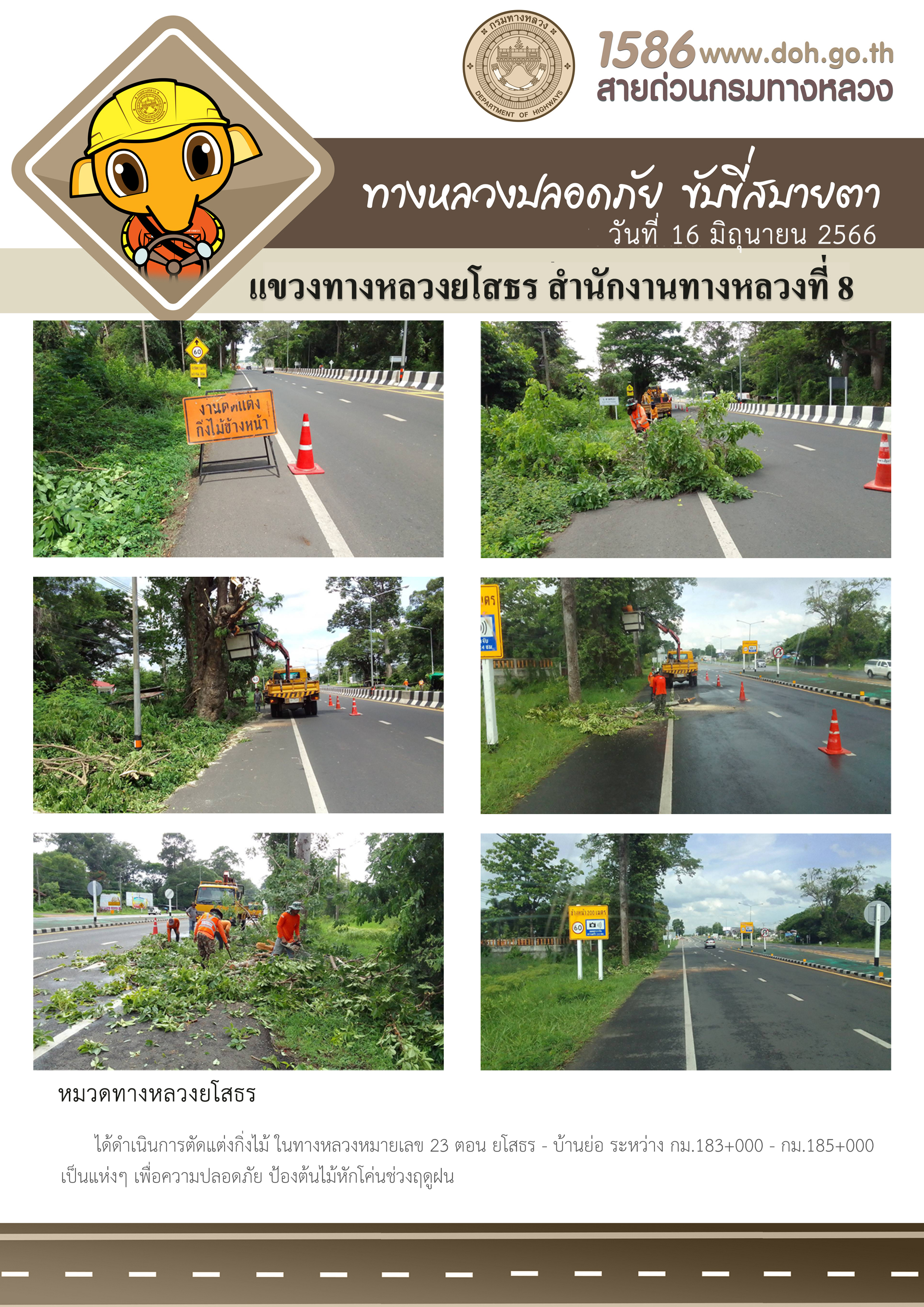 วันที่ 16 มิถุนายน 2566 หมวดทางหลวงยโสธร ได้ดำเนินการตัดแต่งกิ่งไม้ ในทางหลวงหมายเลข 23 ตอน ยโสธร - บ้านย่อ ระหว่าง กม.183+000 - กม.185+000 เป็นแห่งๆ เพื่อความปลอดภัย และป้องกันต้นไม้หักโค่นช่วงฤดูฝน