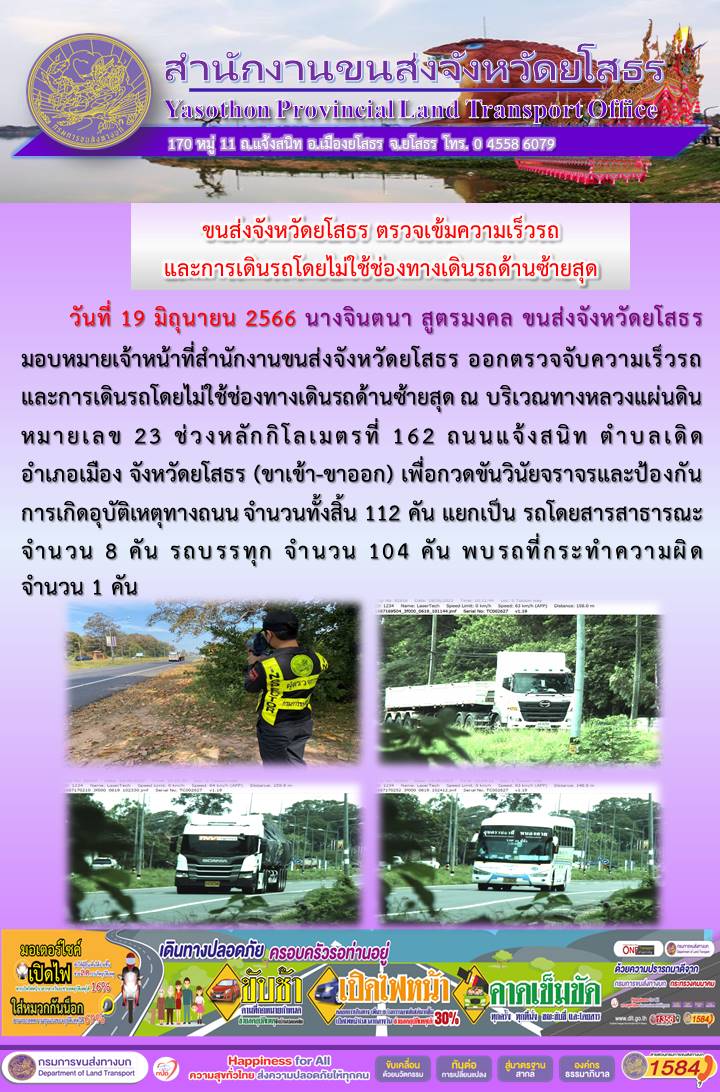 วันที่ 19 มิถุนายน 2566 เจ้าหน้าที่สำนักงานขนส่งจังหวัดยโสธร ออกตั้งจุดตรวจจับความเร็ว