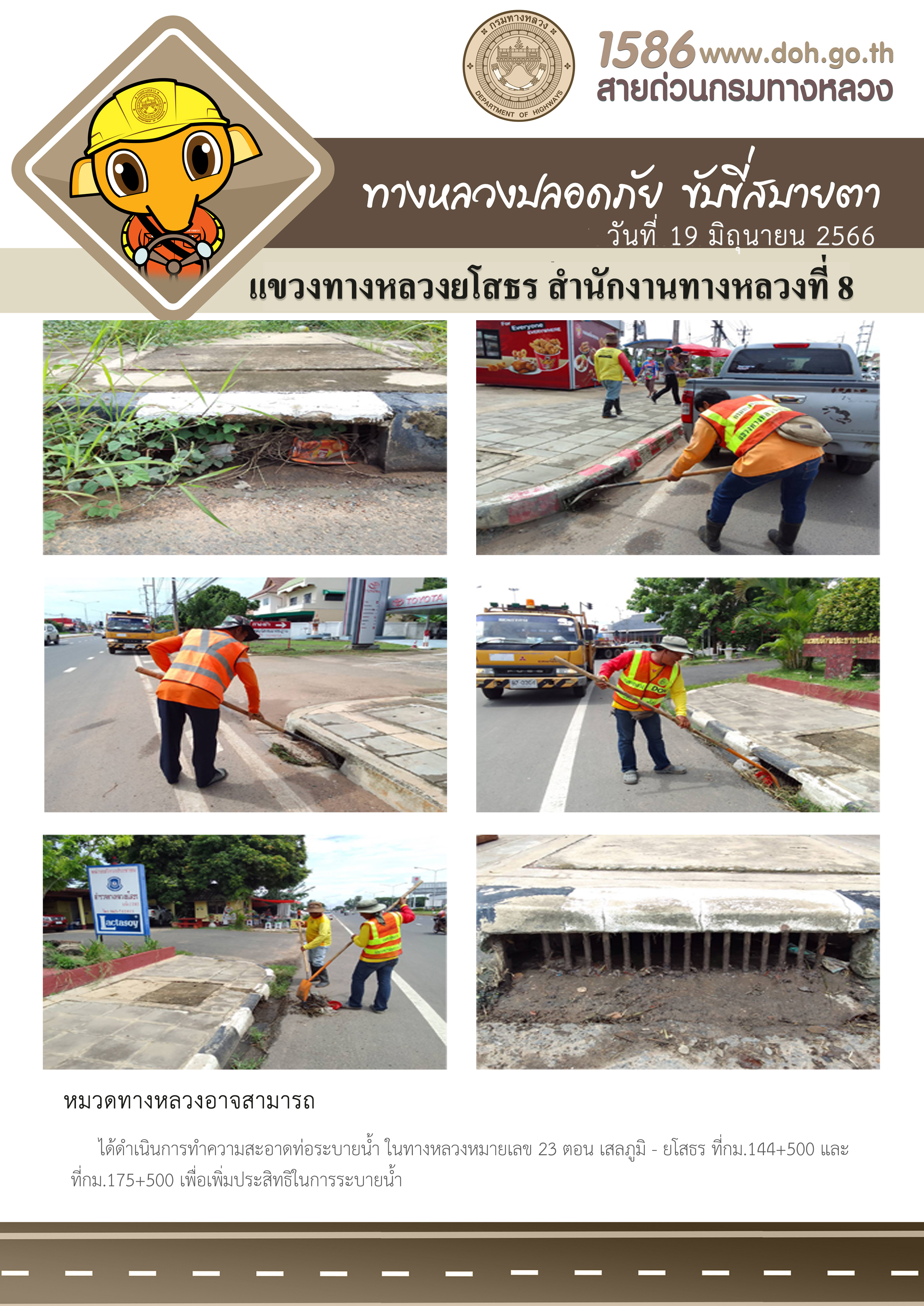 วันที่ 19 มิถุนายน 2566 หมวดทางหลวงอาจสามารถ ได้ดำเนินการทำความสะอาดท่อระบายน้ำ ในทางหลวงหมายเลข 23 ตอน เสลภูมิ - ยโสธร ที่กม.144+500 และ ที่กม.175+500 เพื่อเพิ่มประสิทธิภาพในการระบายน้ำ