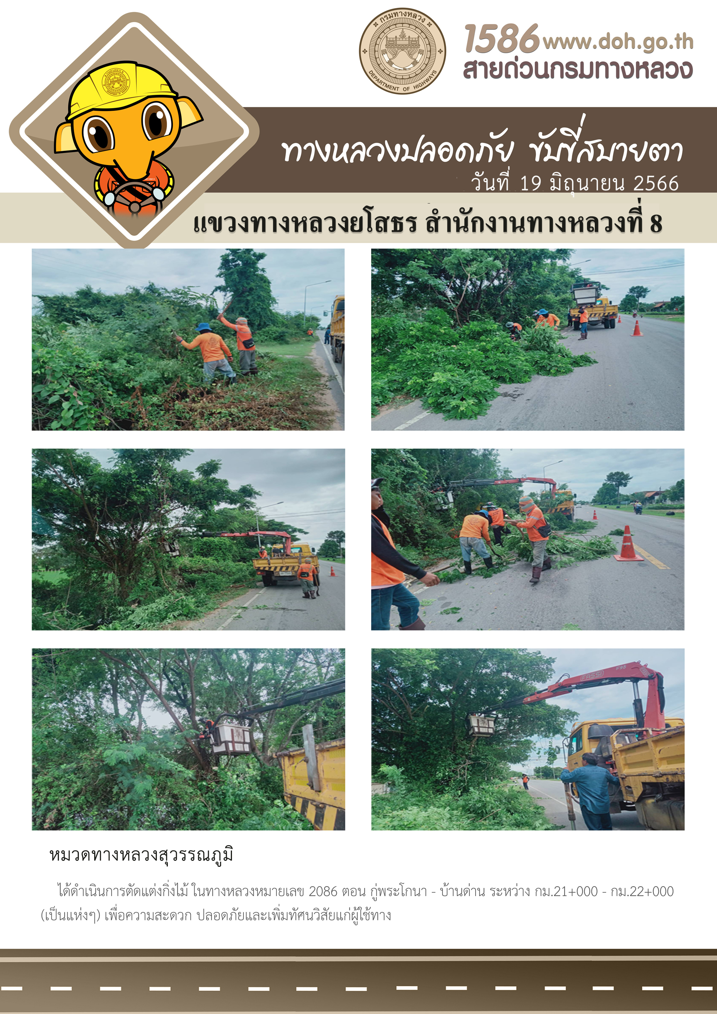 วันที่ 19 มิถุนายน 2566 หมวดทางหลวงสุวรรณภูมิ ได้ดำเนินการตัดแต่งกิ่งไม้ ในทางหลวงหมายเลข 2086 ตอน กู่พระโกนา - บ้านด่าน ระหว่าง กม.21+000 - กม.22+000 (เป็นแห่งๆ) เพื่อความสะดวก ปลอดภัยและเพิ่มทัศนวิสัยแก่ผู้ใช้ทาง