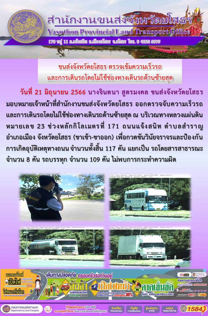 วันที่ 21 มิถุนายน 2566 เจ้าหน้าที่สำนักงานขนส่งจังหวัดยโสธร ออกตั้งจุดตรวจจับความเร็ว