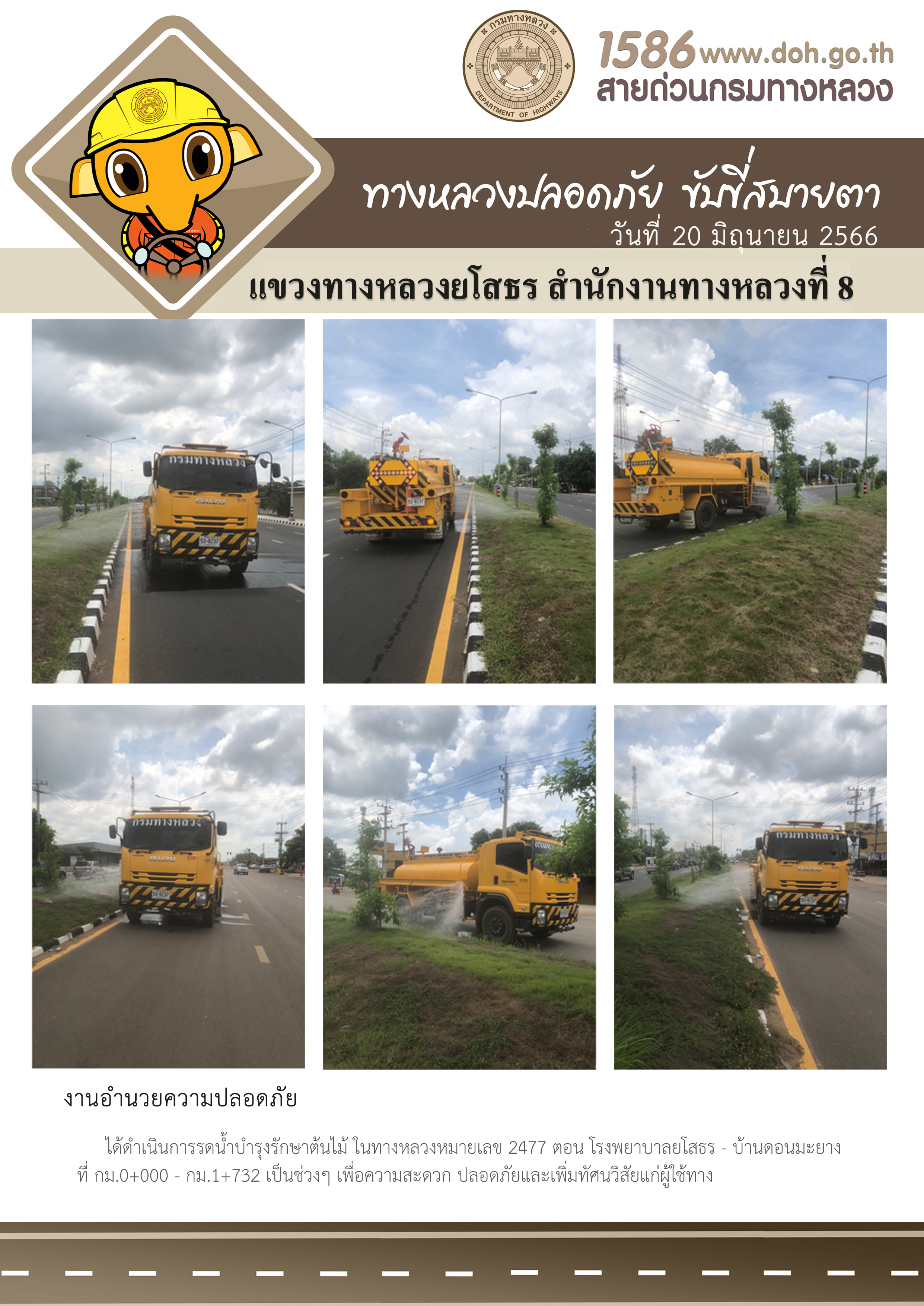 วันที่ 20 มิถุนายน 2566 งานอำนวยความปลอดภัย ได้ดำเนินการรดน้ำบำรุงรักษาต้นไม้ ในทางหลวงหมายเลข 2477 ตอน โรงพยาบาลยโสธร - บ้านดอนมะยาง ที่ กม.0+000 - กม.1+732 เป็นช่วงๆ เพื่อความสะดวก ปลอดภัยและเพิ่มทัศนวิสัยแก่ผู้ใช้ทาง