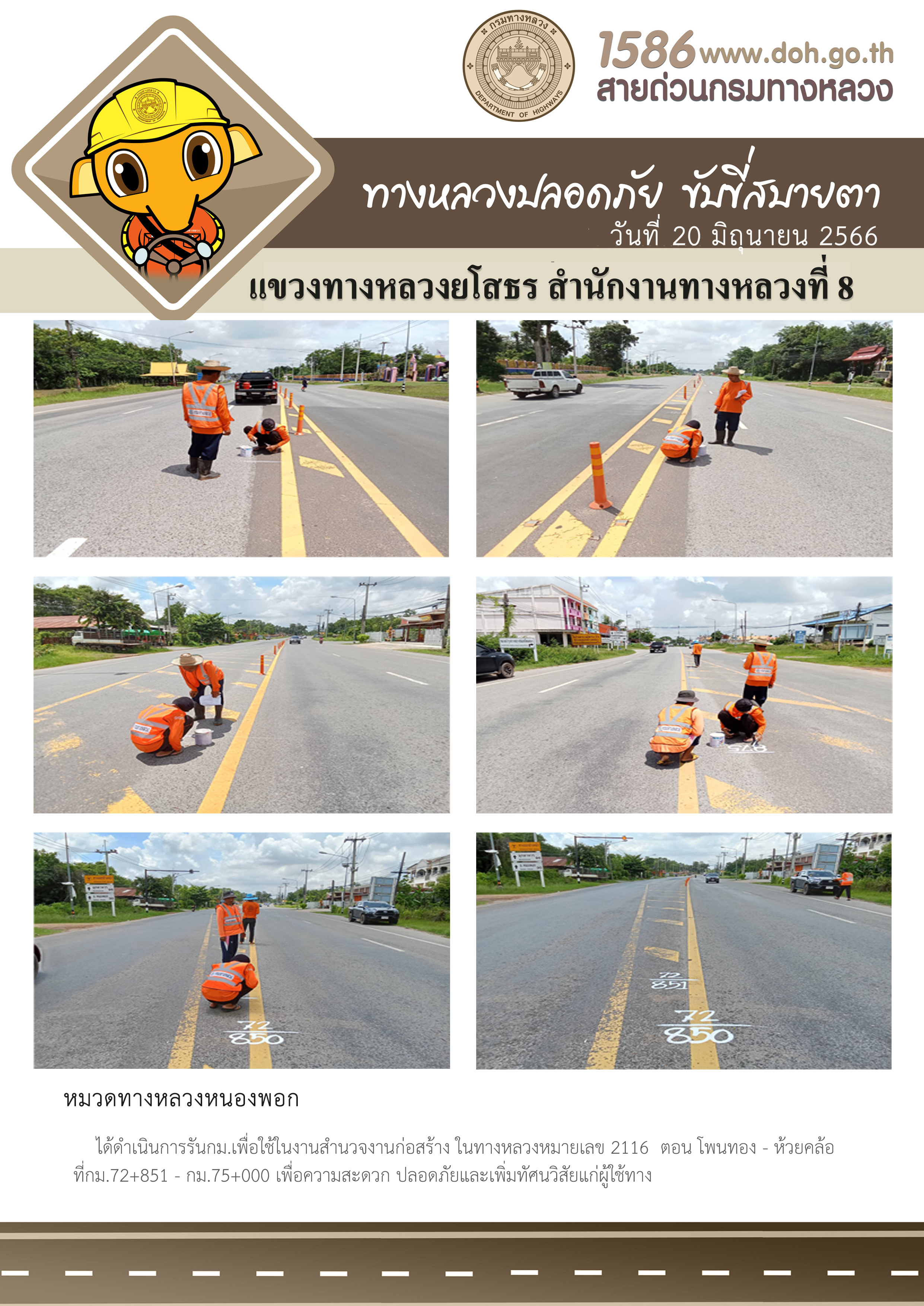 - [10:20] ทั่วไป วันอังคารที่ 31 มีนาคม 2569 หมวดทางหลวงยโสธร ได้ดำเนินการติดตั้งแบบเหล็กเพื่อเตรียมเทเกาะกลางถนน ในทางหลวงหมายเลข 2169 ตอน ยโสธร - กุดชุม ระหว่าง กม.3+000 - กม.3+400 เพื่อความสะดวกปลอดภัย และเพิ่มทัศนวิสัยแก่ผู้ใช้ทาง