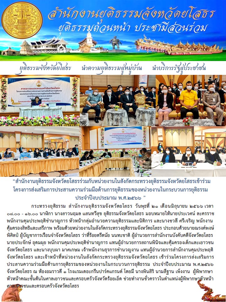 สำนักงานยุติธรรมจังหวัดยโสธรร่วมกับหน่วยงานในสังกัดกระทรวงยุติธรรมจังหวัดยโสธรเข้าร่วมโครงการส่งเสริมการประสานความร่วมมือด้านการยุติธรรมของหน่วยงานในกระบวนการยุติธรรม ประจำปีงบประมาณ พ.ศ.2566