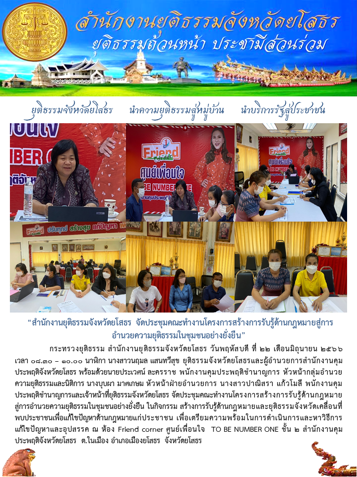 วันที่ 22 มิ.ย. 2566 (16:06 น.)กระทรวงยุติธรรม สำนักงานยุติธรรมจังหวัดยโสธร วันพฤหัสบดี ที่ 22 เดือนมิถุนายน 2566 เวลา 08.30 – 10.00 นาฬิกา นางสาวนฤมล แสนทวีสุข ยุติธรรมจังหวัดยโสธรและผู้อำนวยการสำนักงานคุมประพฤติจังหวัดยโสธร พร้อมด้วยนายประเวศน์ ละครราช พนักงานคุมประพฤติชำนาญการ หัวหน้ากลุ่มอำนวยความยุติธรรมและนิติการ นางบุบผา มาศเกษม หัวหน้าฝ่ายอำนวยการ นางสาวปาณิสรา แก้วโมลี พนักงานคุมประพฤติชำนาญการและเจ้าหน้าที่ยุติธรรมจังหวัดยโสธร จัดประชุมคณะทำงานโครงการสร้างการรับรู้ด้านกฎหมายสู่การอำนวยความยุติธรรมในชุมชนอย่างยั่งยืน ในกิจกรรม สร้างการรับรู้ด้านกฎหมายและยุติธรรมจังหวัดเคลื่อนที่พบประชาชนเพื่อแก้ไขปัญหาด้านกฎหมายแก่ประชาชน เพื่อเตรียมความพร้อมในการดำเนินการและหาวิธีการแก้ไขปัญหาและอุปสรรค ณ ห้อง Friend corner ศูนย์เพื่อนใจ TO BE NUMBER ONE ชั้น 2 สำนักงานคุมประพฤติจังหวัดยโสธร ต.ในเมือง อำเภอเมืองยโสธร จังหวัดยโสธร