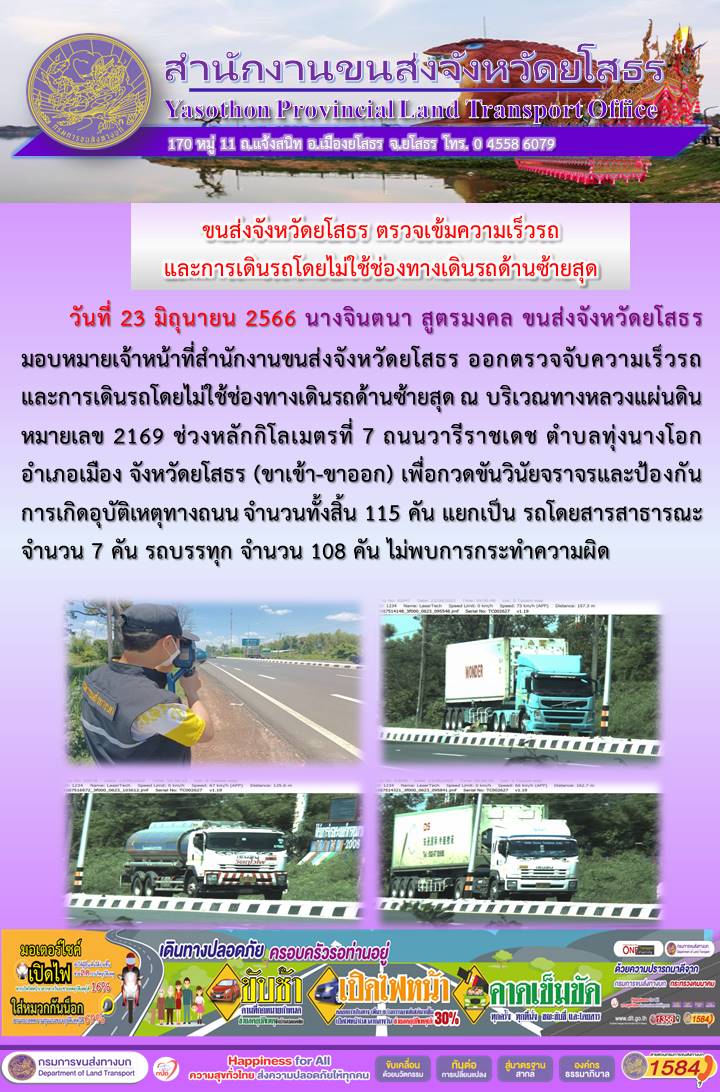 วันที่ 23 มิถุนายน 2566 เจ้าหน้าที่สำนักงานขนส่งจังหวัดยโสธร ออกตั้งจุดตรวจจับความเร็ว