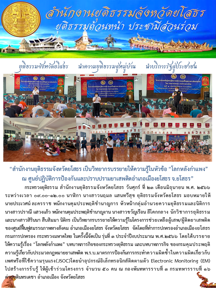 วันที่ 23 มิ.ย. 2566 (14:21 น.)กระทรวงยุติธรรม สำนักงานยุติธรรมจังหวัดยโสธร วันศุกร์ ที่ 23 เดือนมิถุนายน พ.ศ. 2566 ระหว่างเวลา 09.00–12.00 นาฬิกา นางสาวนฤมล แสนทวีสุข ยุติธรรมจังหวัดยโสธร มอบหมายให้ นายประเวศน์ ละครราช พนักงานคุมประพฤติชำนาญการ หัวหน้ากลุ่มอำนวยความยุติธรรมและนิติการ นางสาวปราณี แสวงแก้ว พนักงานคุมประพฤติชำนาญงาน นางสาวขวัญเรือน ลีโคกกลาง นักวิชาการยุติธรรม และนางสาวสิรินนา สืบสิมมา นิติกร เป็นวิทยากรบรรยายให้ความรู้ในโครงการช่วยเหลือผู้เสพ/ผู้ติดยาเสพติดของศูนย์ฟื้นฟูสมรรถภาพทางสังคม อำเภอเมืองยโสธร จังหวัดยโสธร จัดโดยที่ทำการปกครองอำเภอเมืองยโสธร กรมการปกครอง กระทรวงมหาดไทย ในครั้งนี้จัดเป็น รุ่นที่ 3 ประจำปีงบประมาณ พ.ศ.2566 โดยได้บรรยายให้ความรู้เรื่อง “โลกหลังกำแพง” บทบาทภารกิจของกระทรวงยุติธรรม และบทบาทภารกิจ ของกรมคุมประพฤติ ความรู้เกี่ยวกับประมวลกฎหมายยาเสพติด พ.ร.บ.มาตรการป้องกันการกระทำความผิดซ้ำในความผิดเกี่ยวกับเพศหรือที่ใช้ความรุนแรง(JSOC)โดยนำอุปกรณ์อิเล็กทรอนิกส์ติดตามตัว Electronic Monitoring (EM) ไปสร้างการรับรู้ ให้ผู้เข้าร่วมโครงการ จำนวน ๕๐ คน ณ กองพันทหารราบที่ 3 กรมทหารราบที่ 16 ค่ายบดินทรเดชา อำเภอเมือง จังหวัดยโสธร