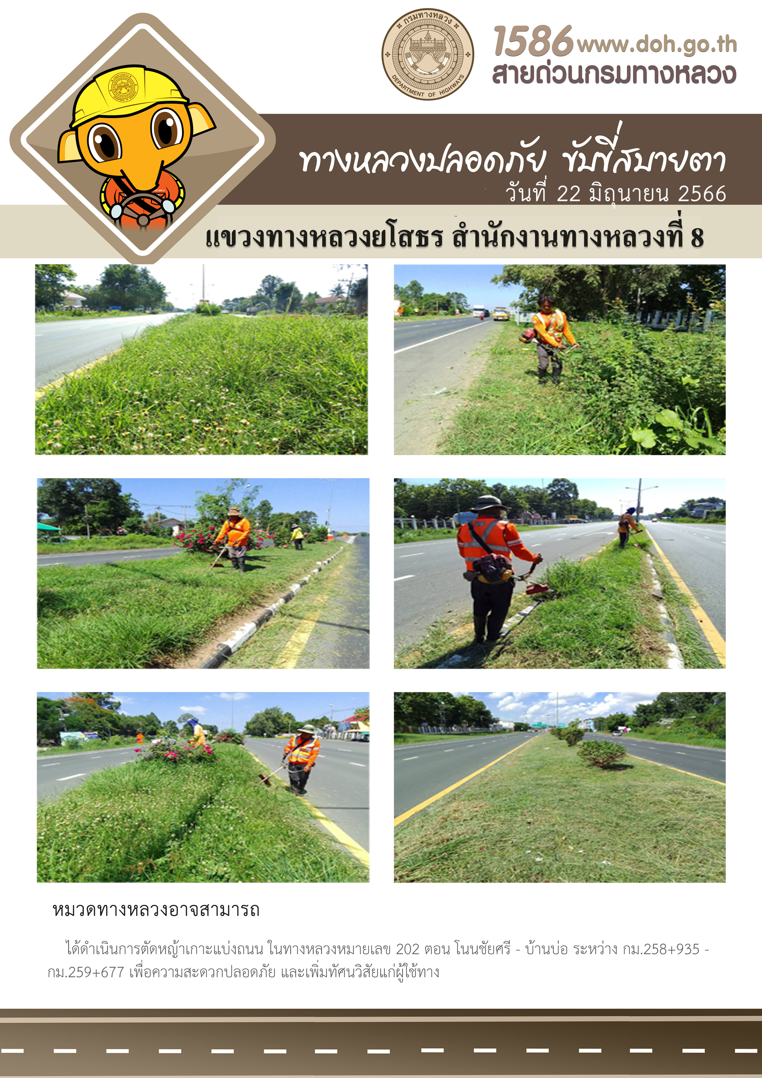 - [10:14] ทั่วไป วันอังคารที่ 31 มีนาคม 2569 หมวดทางหลวงคำเขื่อนแก้ว ได้ดำเนินการตัดหญ้าข้างทาง ในทางหลวงหมายเลข 23 ตอน บ้านย่อ - บ้านสวน ระหว่าง กม.204+000 - กม.205+000 เพื่อความสะดวก ปลอดภัย และเพิ่มทัศนวิสัยแก่ผู้ใช้ทาง