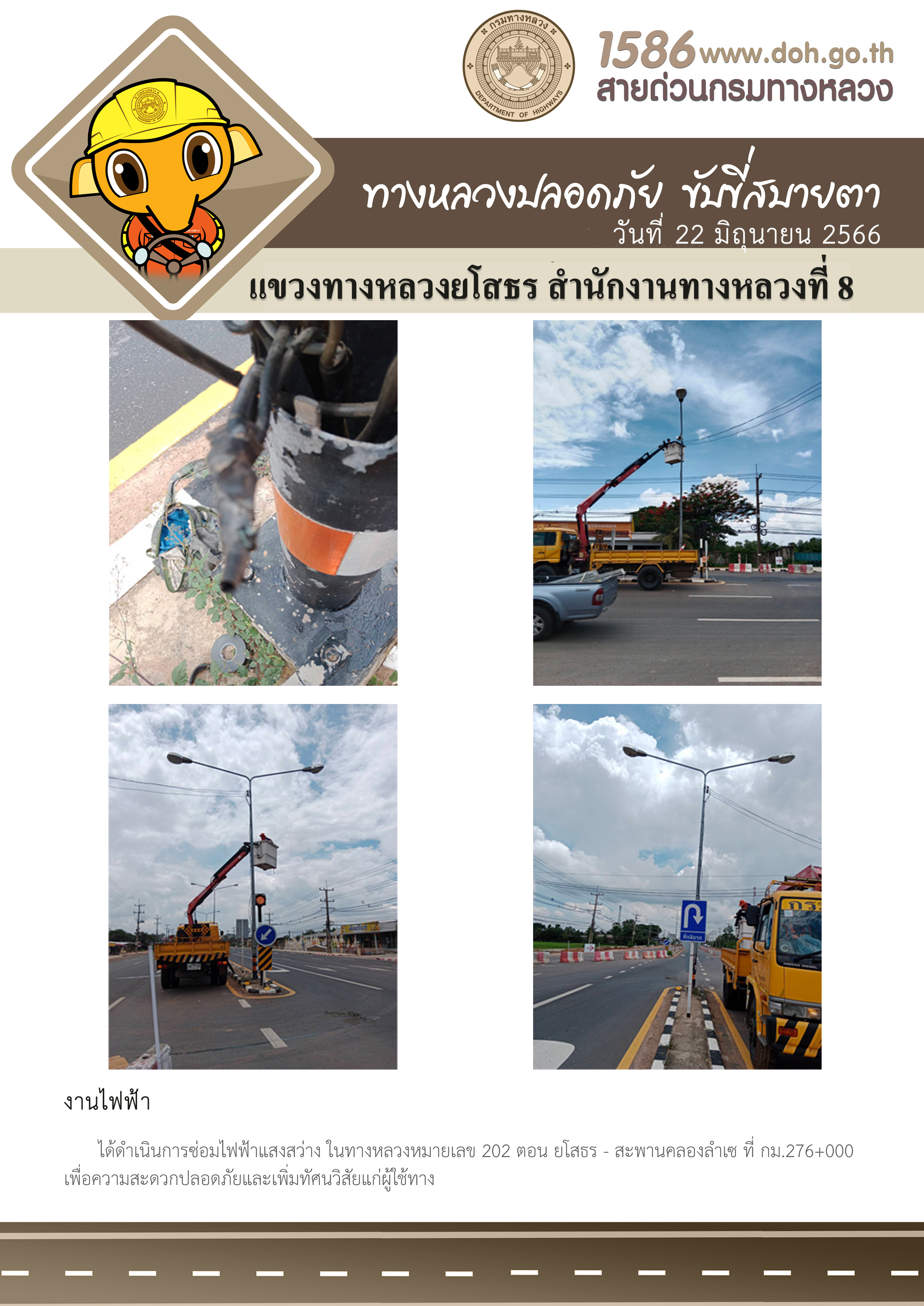 วันที่ 22 มิถุนายน 2566 งานไฟฟ้า ได้ดำเนินการซ่อมไฟฟ้าแสงสว่าง ในทางหลวงหมายเลข 202 ตอน ยโสธร - สะพานคลองลำเซ ที่ กม.276+000 เพื่อความสะดวกปลอดภัยและเพิ่มทัศนวิสัยแก่ผู้ใช้ทาง