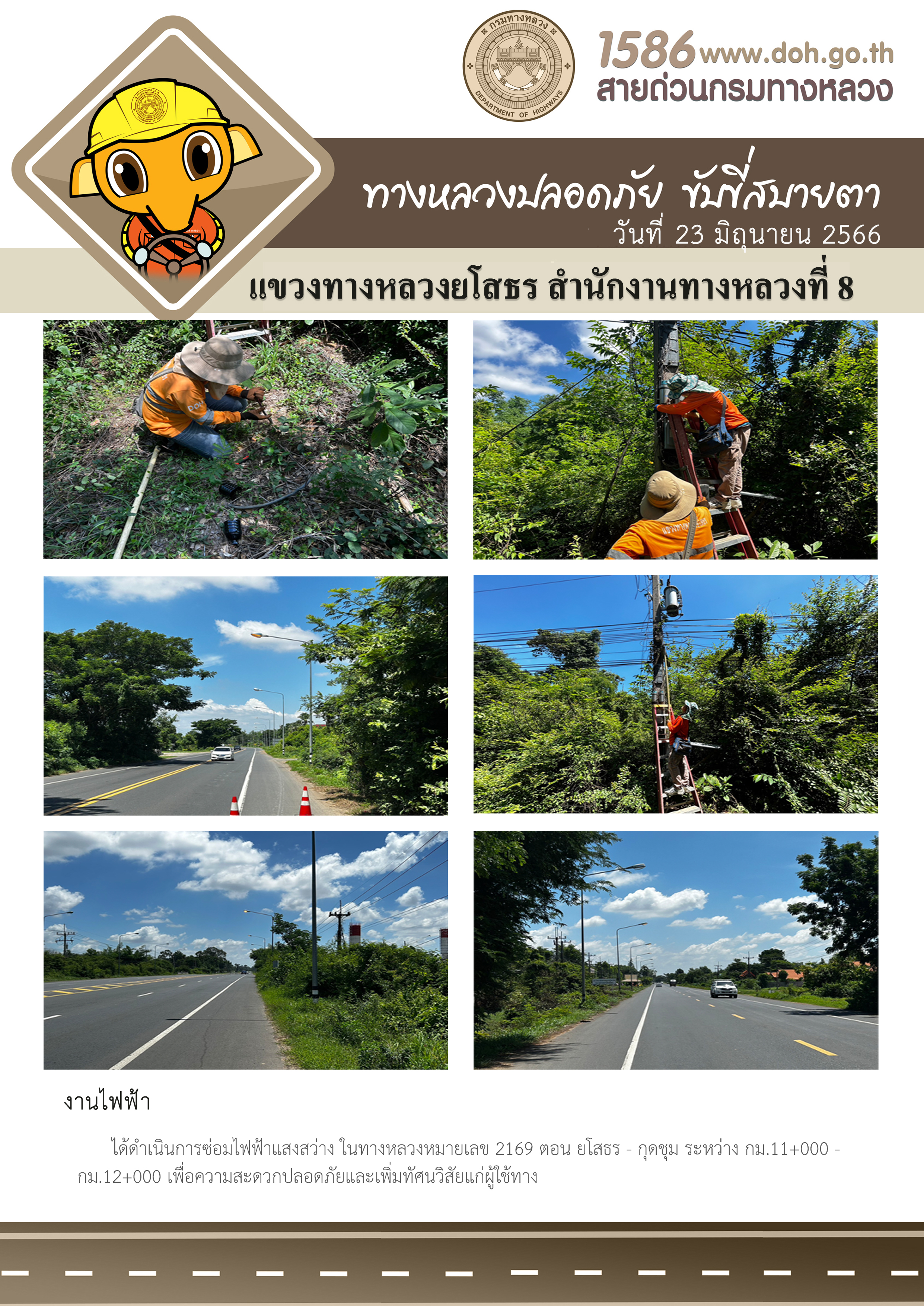 วันที่ 23 มิถุนายน 2566 งานไฟฟ้า ได้ดำเนินการซ่อมไฟฟ้าแสงสว่าง ในทางหลวงหมายเลข 2169 ตอน ยโสธร - กุดชุม ระหว่าง กม.11+000 - กม.12+000 เพื่อความสะดวกปลอดภัยและเพิ่มทัศนวิสัยแก่ผู้ใช้ทาง