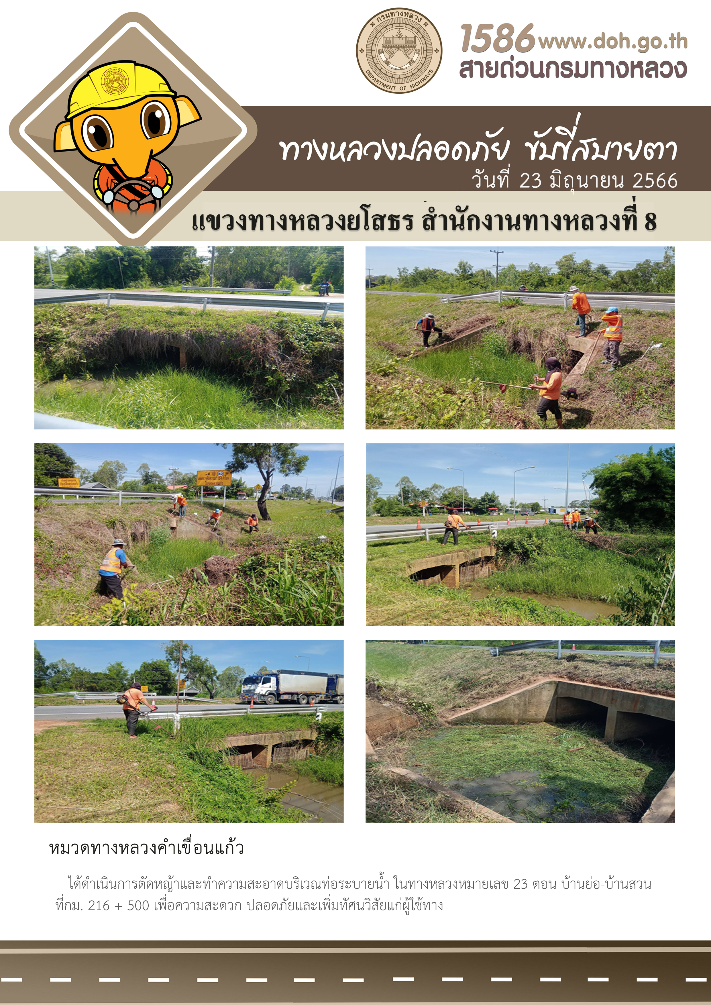 วันที่ 23 มิถุนายน 2566 หมวดทางหลวงคำเขื่อนแก้ว ได้ดำเนินการตัดหญ้าและทำความสะอาดบริเวณท่อระบายน้ำ ในทางหลวงหมายเลข 23 ตอน บ้านย่อ-บ้านสวน ที่กม.216+500 เพื่อความสะดวก ปลอดภัยและเพิ่มทัศนวิสัยแก่ผู้ใช้ทาง