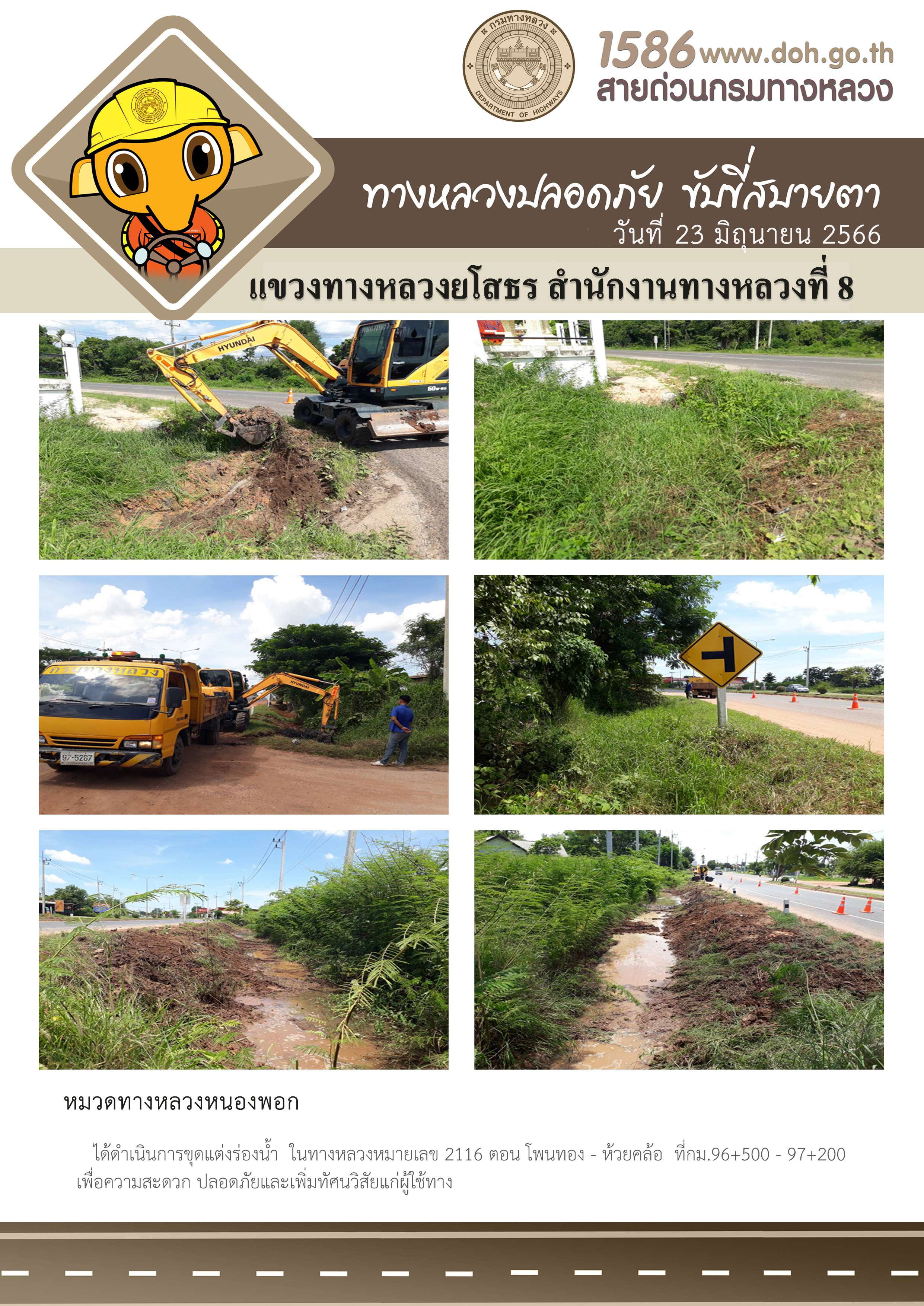 วันที่ 23 มิถุนายน 2566 หมวดทางหลวงหนองพอก ได้ดำเนินการขุดแต่งร่องน้ำ ในทางหลวงหมายเลข 2116 ตอน โพนทอง - ห้วยคล้อ ที่กม.96+500 - กม.97+200 เพื่อความสะดวก ปลอดภัยและเพิ่มทัศนวิสัยแก่ผู้ใช้ทาง