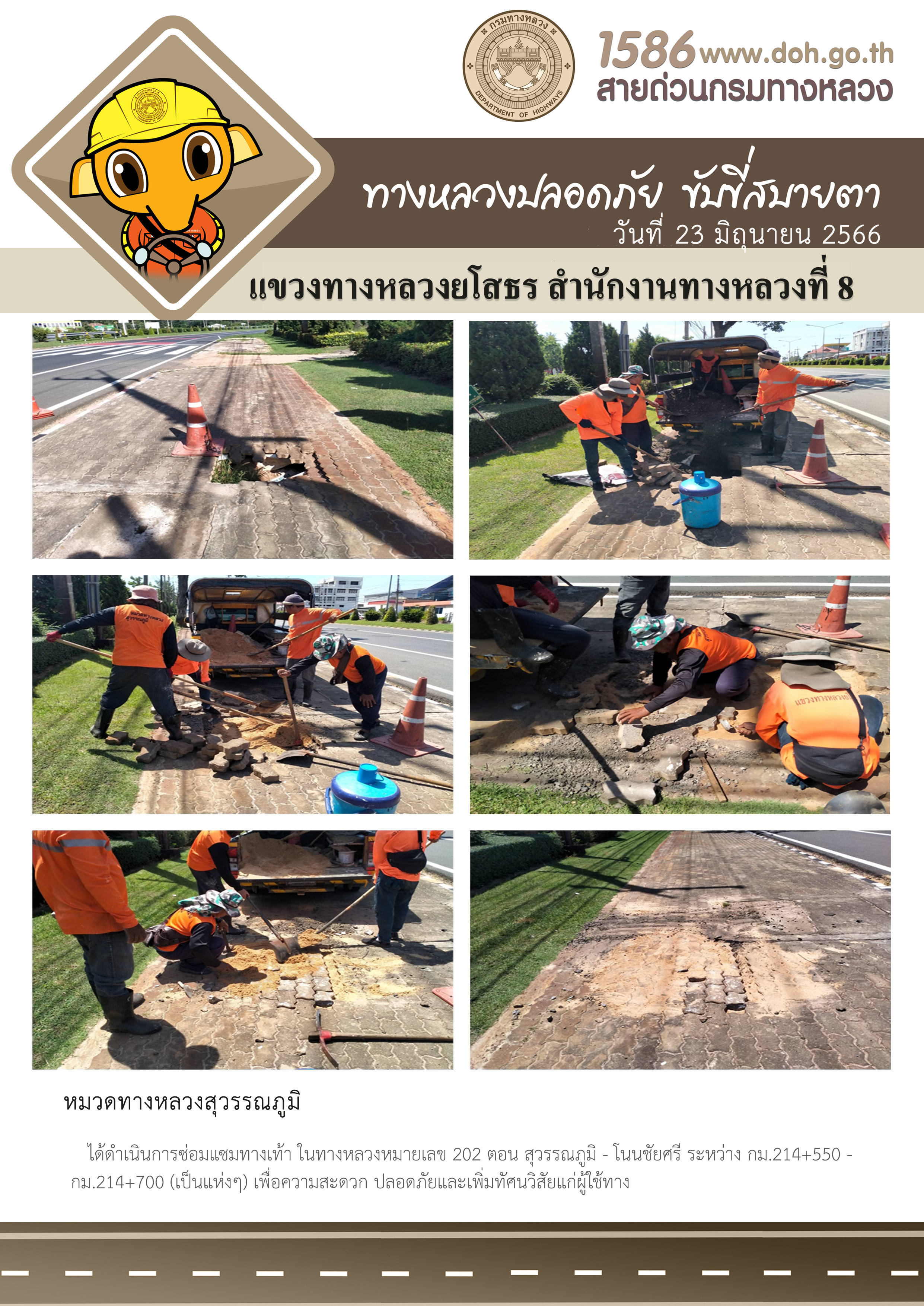 วันที่ 23 มิถุนายน 2566 หมวดทางหลวงสุวรรณภูมิ ได้ดำเนินการซ่อมแซมทางเท้า ในทางหลวงหมายเลข 202 ตอน สุวรรณภูมิ - โนนชัยศรี ระหว่าง กม.214+550 - กม.214+700 (เป็นแห่งๆ) เพื่อความสะดวก ปลอดภัยและเพิ่มทัศนวิสัยแก่ผู้ใช้ทาง