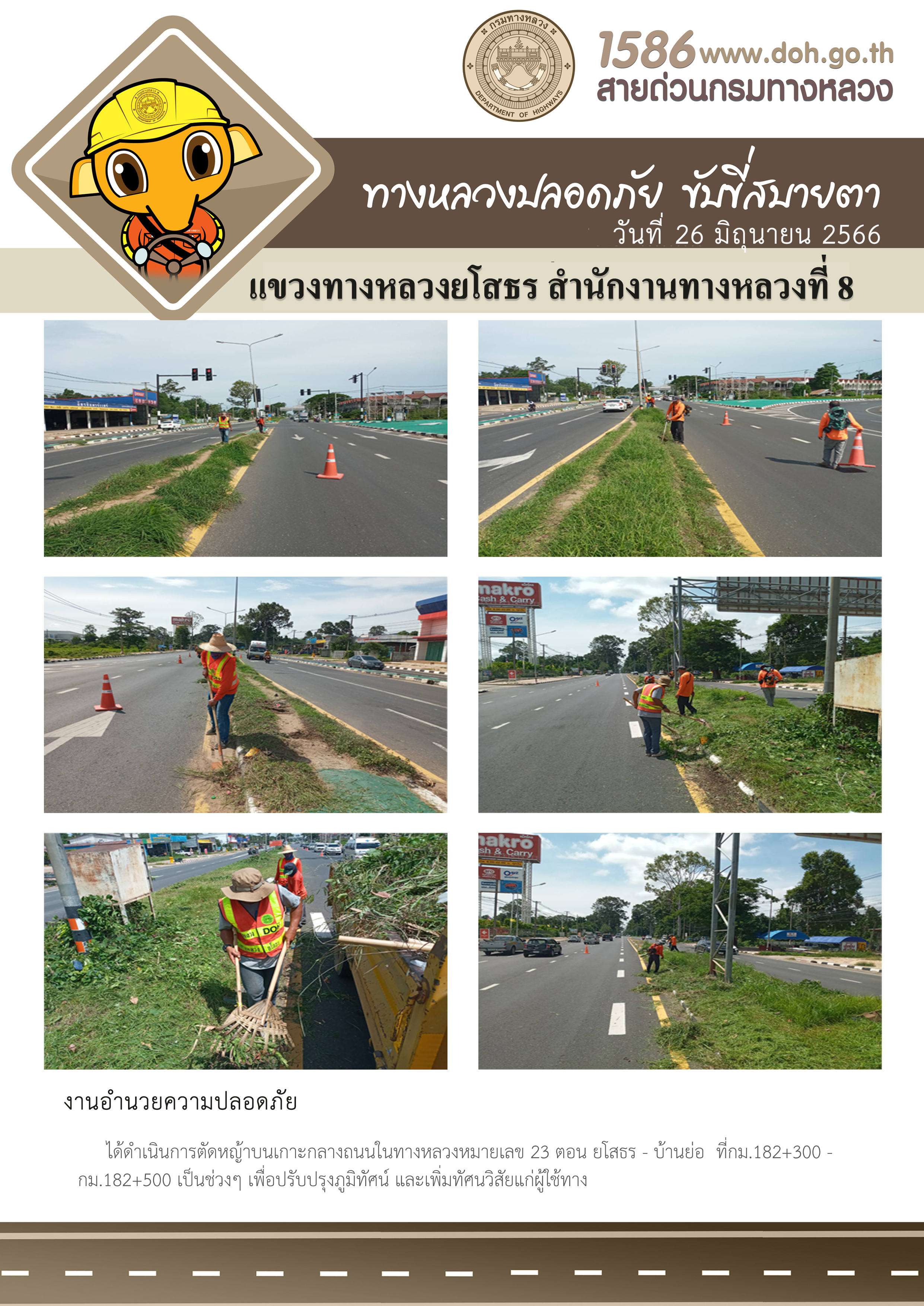 วันที่ 26 มิถุนายน 2566 งานอำนวยความปลอดภัย ได้ดำเนินการตัดหญ้าบนเกาะกลางถนนในทางหลวงหมายเลข 23 ตอน ยโสธร - บ้านย่อ ที่กม.182+300 - กม.182+500 เป็นช่วงๆ เพื่อปรับปรุงภูมิทัศน์ และเพิ่มทัศนวิสัยแก่ผู้ใช้ทาง