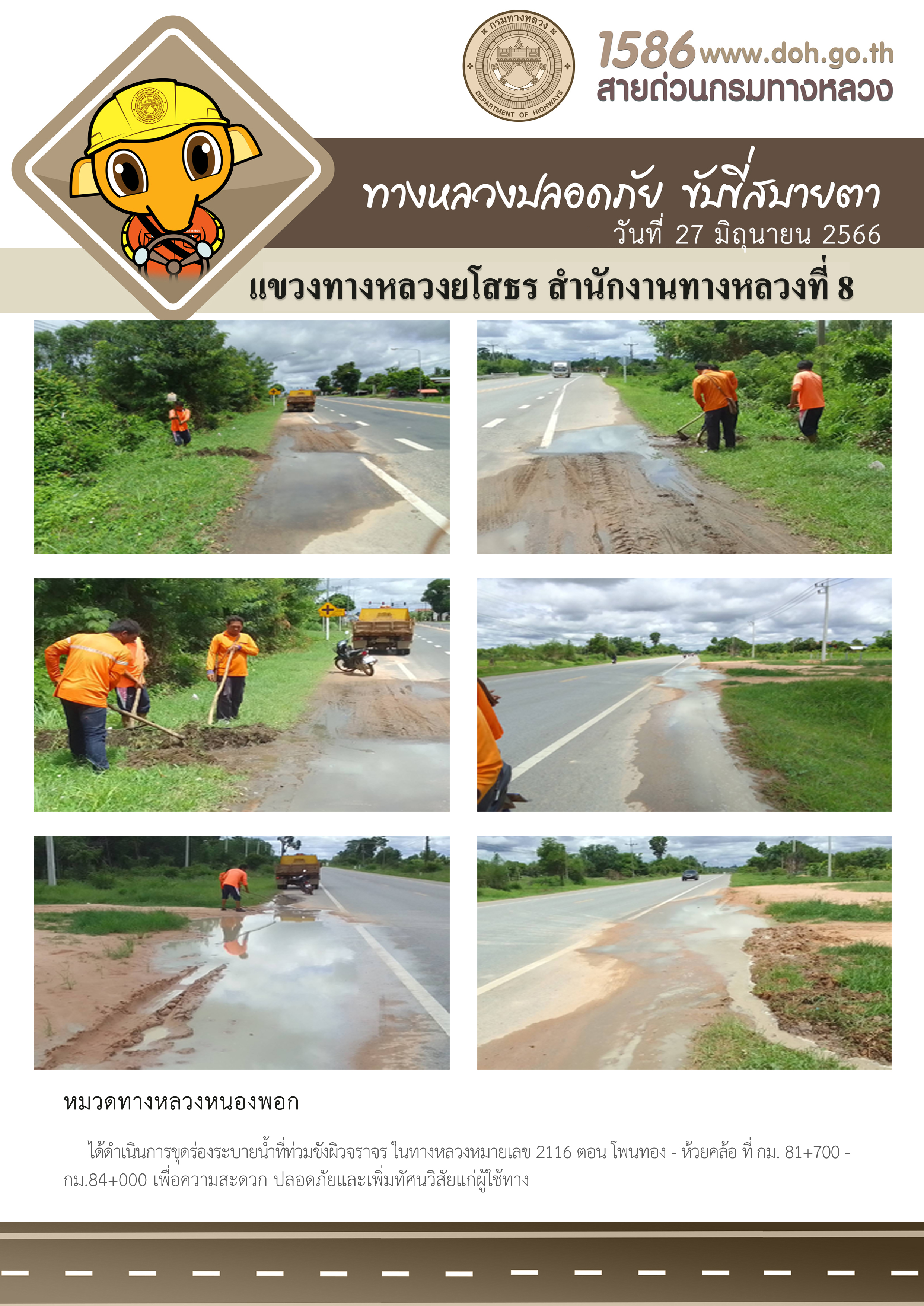 วันที่ 27 มิถุนายน 2566 หมวดทางหลวงหนองพอก ได้ดำเนินการขุดร่องระบายน้ำที่ท่วมขังผิวจราจร ในทางหลวงหมายเลข 2116 ตอน โพนทอง - ห้วยคล้อ ที่ กม. 81+700 - กม.84+000 เพื่อความสะดวก ปลอดภัยและเพิ่มทัศนวิสัยแก่ผู้ใช้ทาง