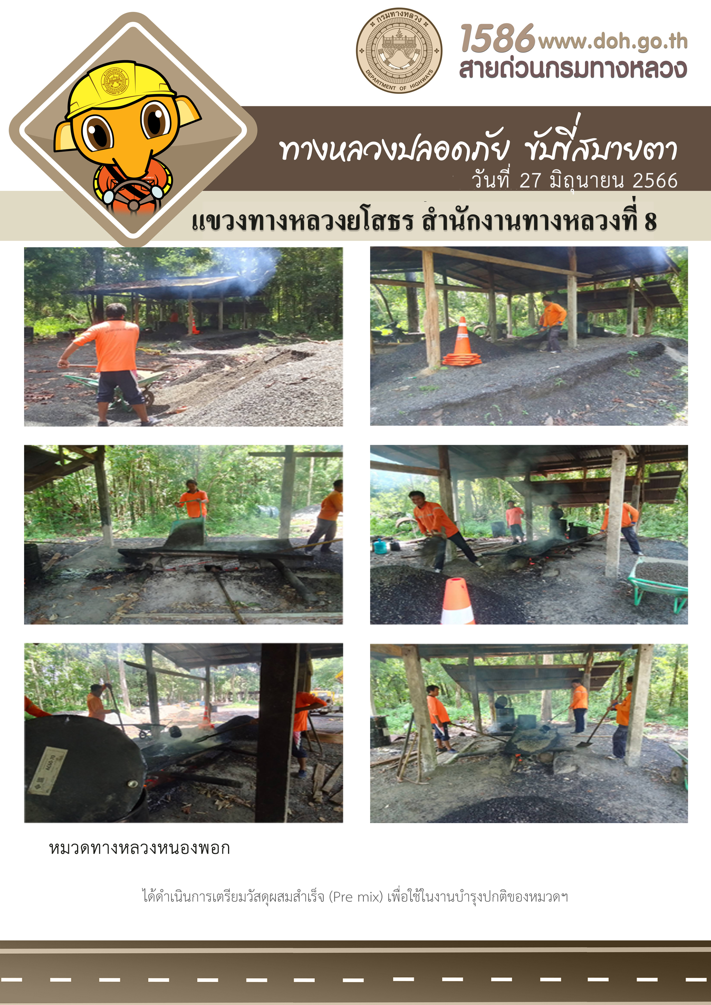 วันที่ 27 มิถุนายน 2566 หมวดทางหลวงหนองพอก ได้ดำเนินการเตรียมวัสดุผสมสำเร็จ (Pre mix) เพื่อใช้ในงานบำรุงปกติของหมวดฯ