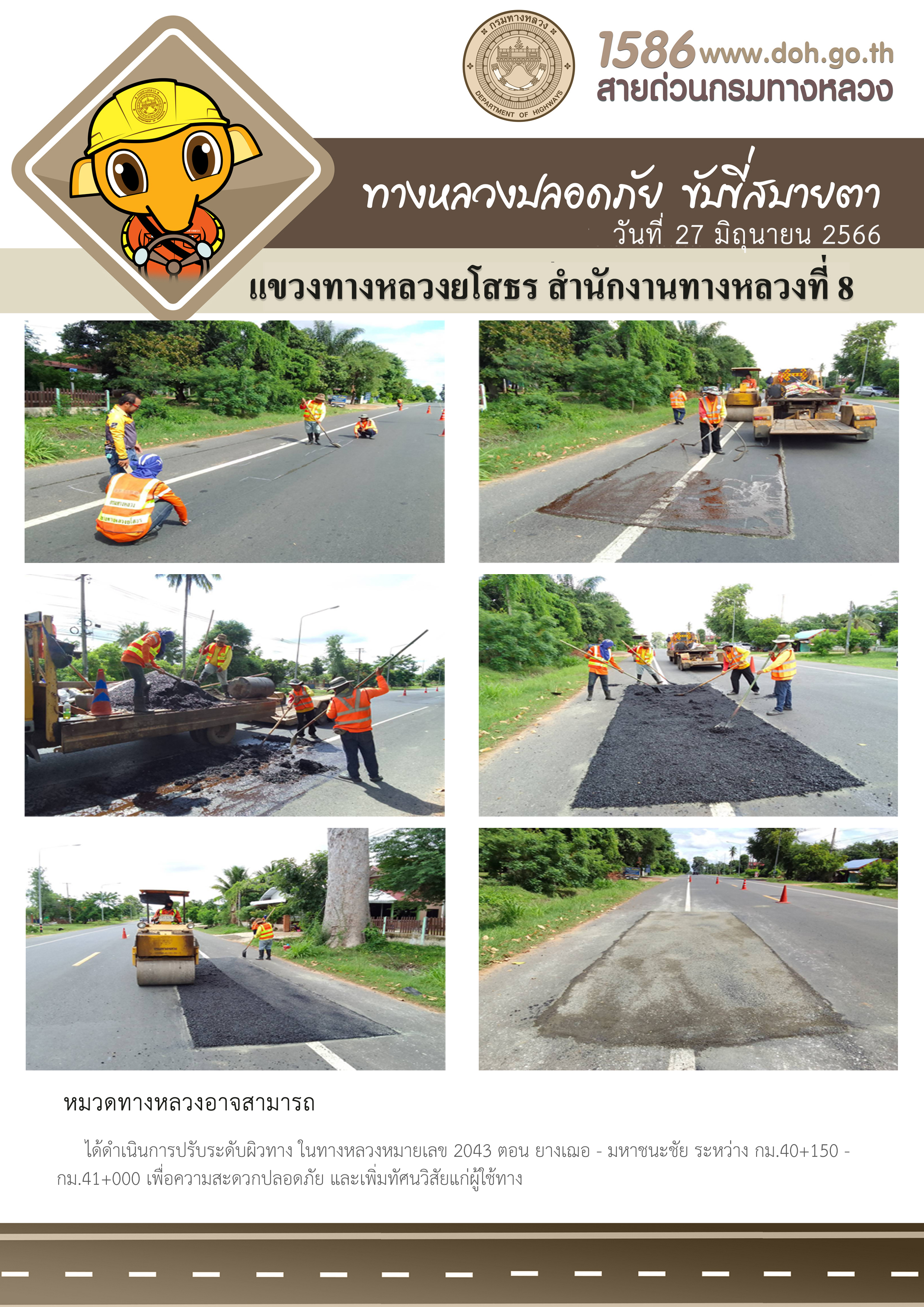 วันที่ 27 มิถุนายน 2566 หมวดทางหลวงอาจสามารถ ได้ดำเนินการปรับระดับผิวทาง ในทางหลวงหมายเลข 2043 ตอน ยางเฌอ - มหาชนะชัย ระหว่าง กม.40+150 - กม.41+000 เพื่อความสะดวกปลอดภัย และเพิ่มทัศนวิสัยแก่ผู้ใช้ทาง