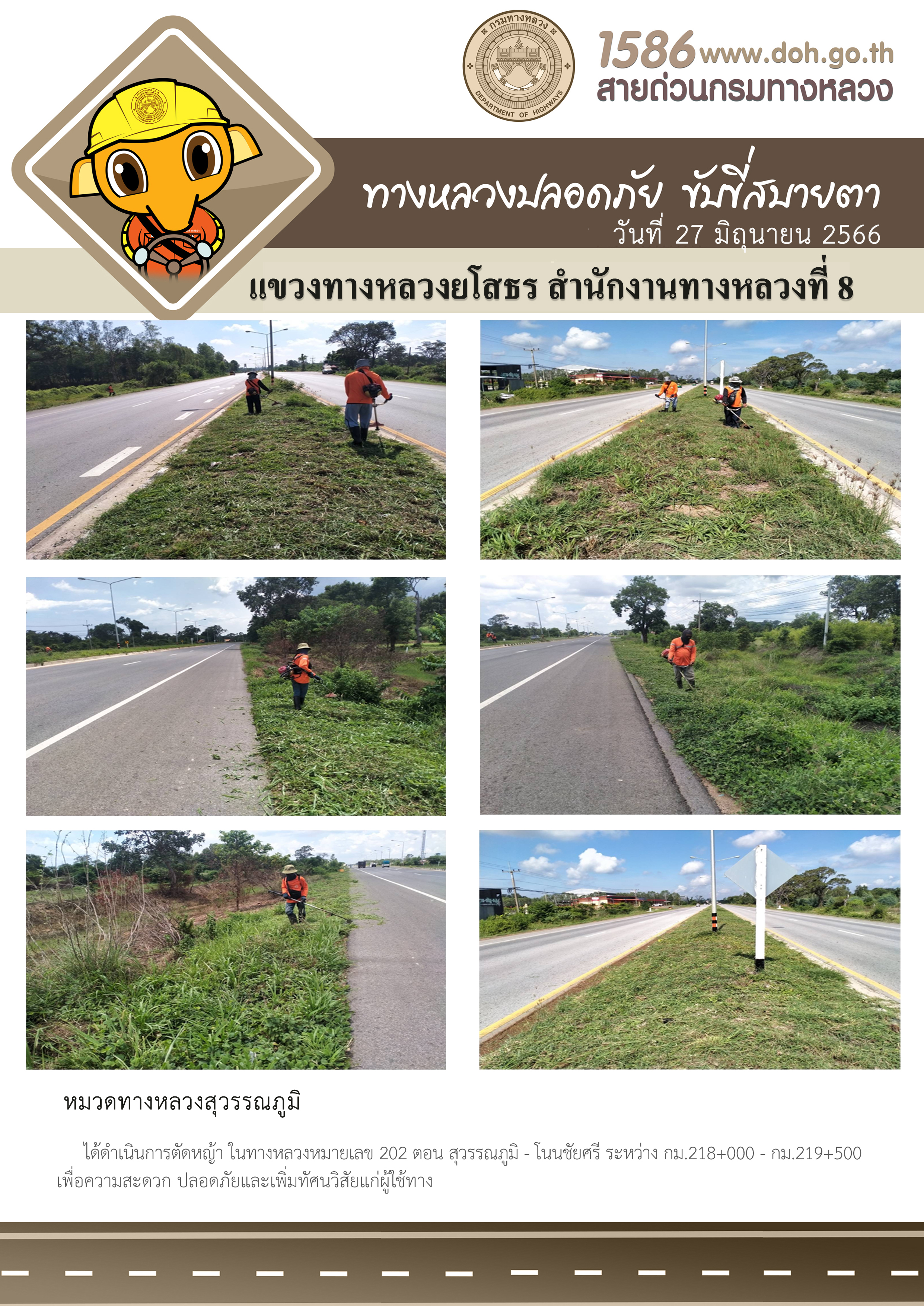 วันที่ 27 มิถุนายน 2566 หมวดทางหลวงสุวรรณภูมิ ได้ดำเนินการตัดหญ้า ในทางหลวงหมายเลข 202 ตอน สุวรรณภูมิ - โนนชัยศรี ระหว่าง กม.218+000 - กม.219+500 เพื่อความสะดวก ปลอดภัยและเพิ่มทัศนวิสัยแก่ผู้ใช้ทาง