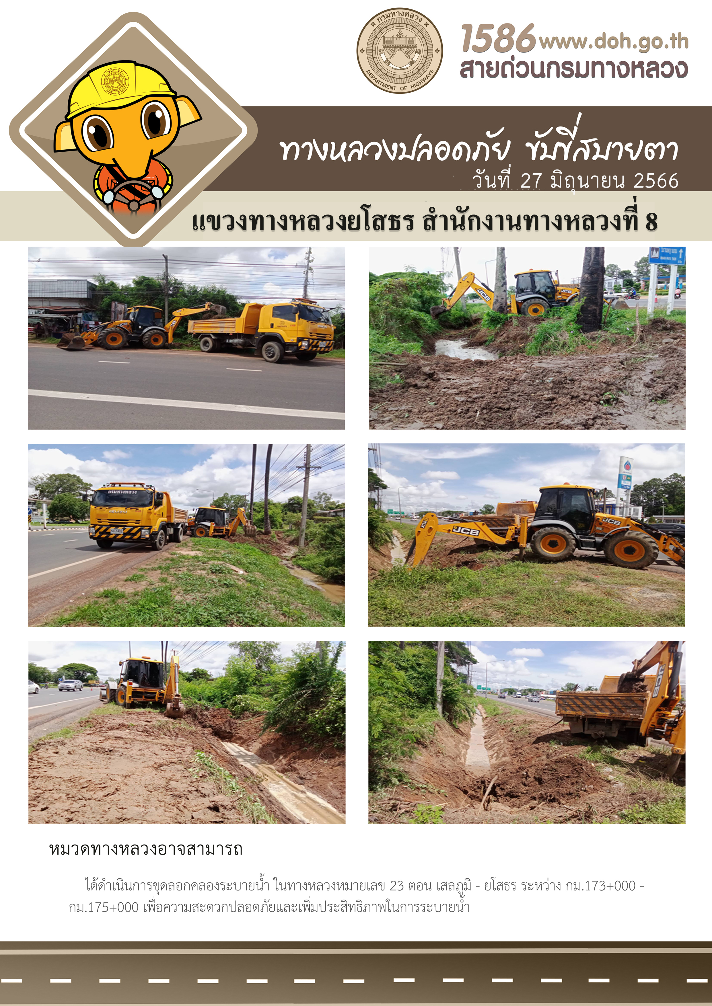 วันที่ 27 มิถุนายน 2566 หมวดทางหลวงอาจสามารถ ได้ดำเนินการขุดลอกคลองระบายน้ำ ในทางหลวงหมายเลข 23 ตอน เสลภูมิ - ยโสธร ระหว่าง กม.173+000 - กม.175+000 เพื่อความสะดวกปลอดภัยและเพิ่มประสิทธิภาพในการระบายน้ำ