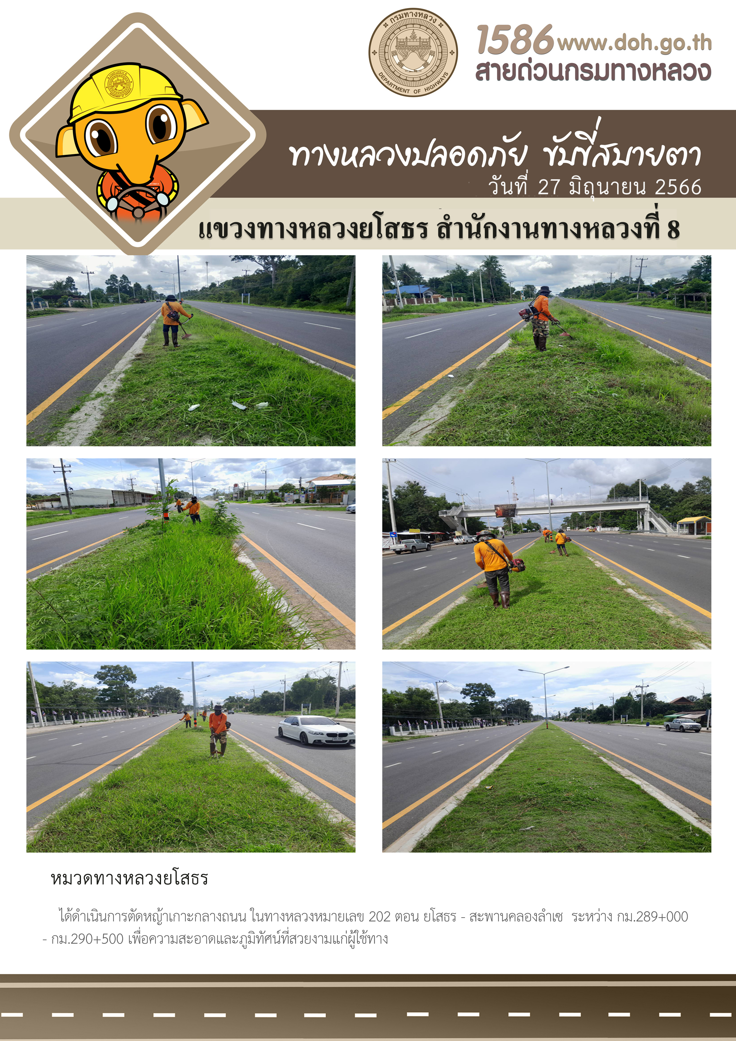 วันที่ 27 มิถุนายน 2566 หมวดทางหลวงยโสธร ได้ดำเนินการตัดหญ้าเกาะกลางถนน ในทางหลวงหมายเลข 202 ตอน ยโสธร - สะพานคลองลำเซ ระหว่าง กม.289+000 - กม.290+500 เพื่อความสะอาดและภูมิทัศน์ที่สวยงามแก่ผู้ใช้ทาง