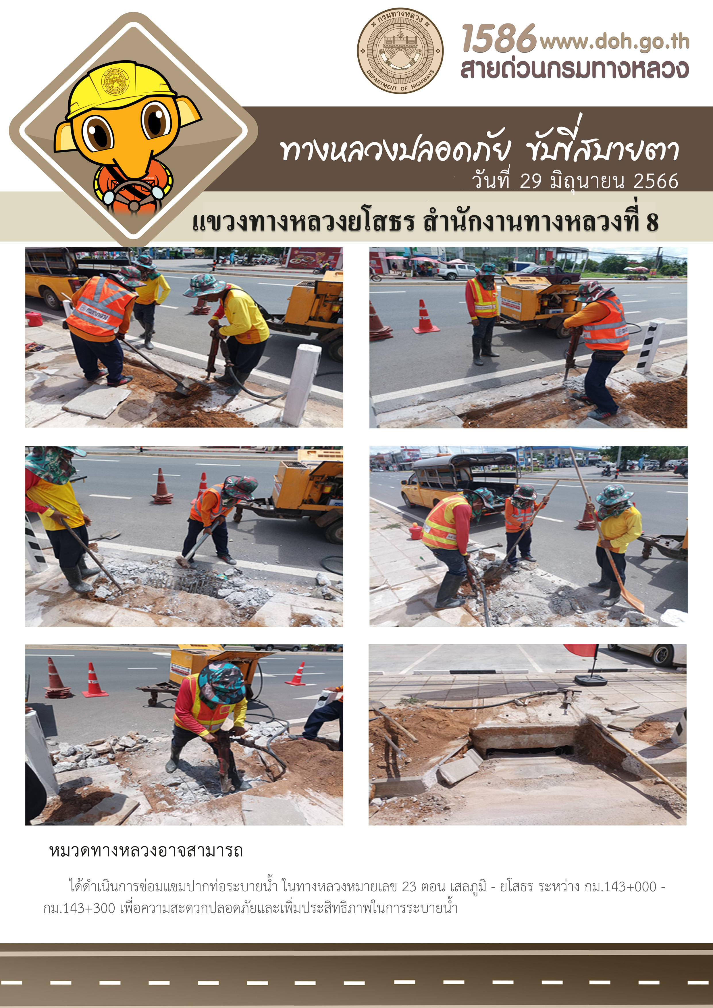 วันที่ 29 มิถุนายน 2566 หมวดทางหลวงอาจสามารถ ได้ดำเนินการซ่อมแซมปากท่อระบายน้ำ ในทางหลวงหมายเลข 23 ตอน เสลภูมิ - ยโสธร ระหว่าง กม.143+000 - กม.143+300 เพื่อความสะดวกปลอดภัยและเพิ่มประสิทธิภาพในการระบายน้ำ