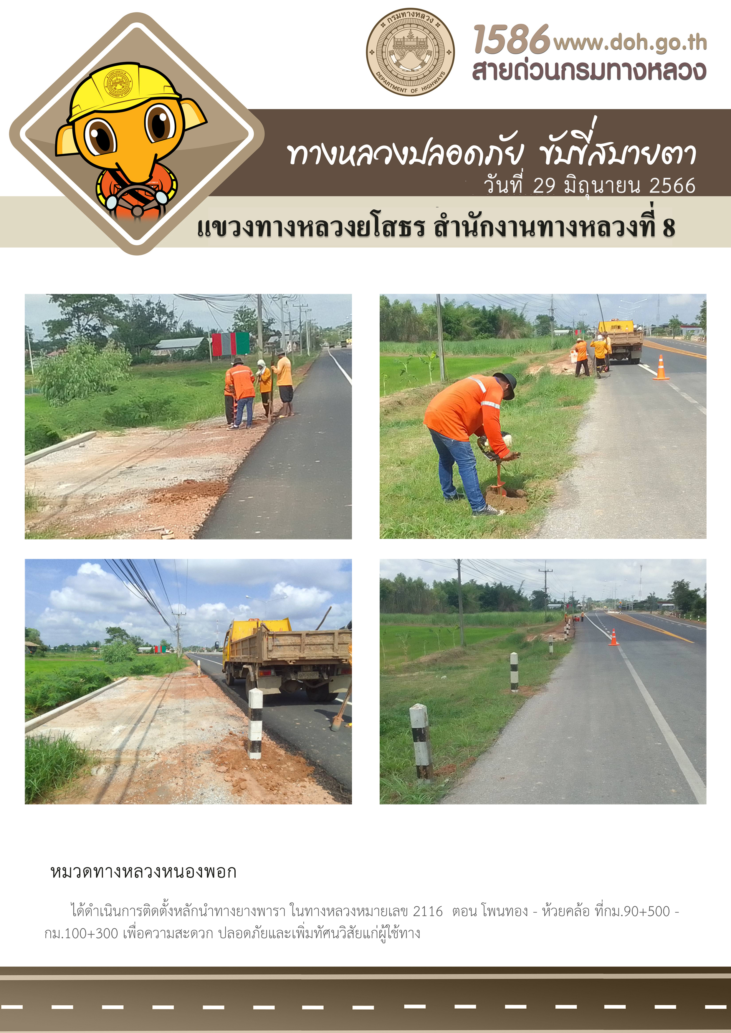 วันที่ 29 มิถุนายน 2566 หมวดทางหลวงหนองพอก ได้ดำเนินการติดตั้งหลักนำทางยางพารา ในทางหลวงหมายเลข 2116 ตอน โพนทอง - ห้วยคล้อ ที่กม.90+500 - กม.100+300 เพื่อความสะดวก ปลอดภัยและเพิ่มทัศนวิสัยแก่ผู้ใช้ทาง