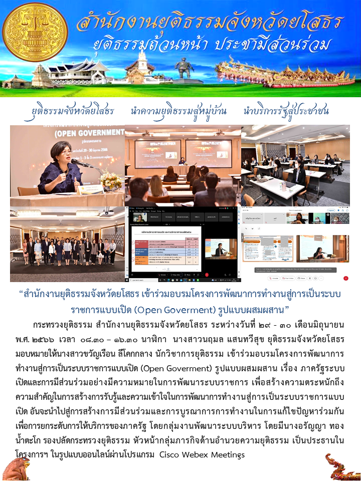 วันที่ 30 มิ.ย. 2566 (16:03 น.)กระทรวงยุติธรรม สำนักงานยุติธรรมจังหวัดยโสธร ระหว่างวันที่ 29 - 30 เดือนมิถุนายน พ.ศ. 2566 เวลา 08.30 – 16.30 นาฬิกา นางสาวนฤมล แสนทวีสุข ยุติธรรมจังหวัดยโสธร มอบหมายให้นางสาวขวัญเรือน ลีโคกกลาง นักวิชาการยุติธรรม เข้าร่วมอบรมโครงการพัฒนาการทำงานสู่การเป็นระบบราชการแบบเปิด (Open Goverment) รูปแบบผสมผสาน เรื่อง ภาครัฐระบบเปิดและการมีส่วนร่วมอย่างมีความหมายในการพัฒนาระบบราชการ เพื่อสร้างความตระหนักถึงความสำคัญในการสร้างการรับรู้และความเข้าใจในการพัฒนาการทำงานสู่การเป็นระบบราชการแบบเปิด อันจะนำไปสู่การสร้างการมีส่วนร่วมและการบูรณาการการทำงานในการแก้ไขปัญหาร่วมกันเพื่อการยกระดับการให้บริการของภาครัฐ โดยกลุ่มงานพัฒนาระบบบริหาร โดยมีนางอรัญญา ทองน้ำตะโก รองปลัดกระทรวงยุติธรรม หัวหน้ากลุ่มภารกิจด้านอำนวยความยุติธรรม เป็นประธานในโครงการฯ ในรูปแบบออนไลน์ผ่านโปรแกรม Cisco Webex Meetings