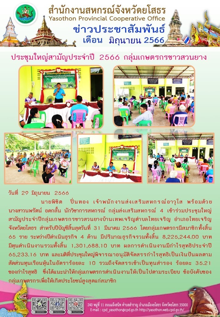 นายพิชิต ปิ่นทอง เจ้าพนักงานส่งเสริมสหกรณ์อาวุโส พร้อมด้วยเจ้าหน้าที่สำนักงานสหกรณ์จังหวัดยโสธร เข้าร่วมประชุมใหญ่สามัญประจำปีกลุ่มเกษตรกรชาวสวนยางบ้านเทพเจริญตำบลไทยเจริญ อำเภอไทยเจริญ