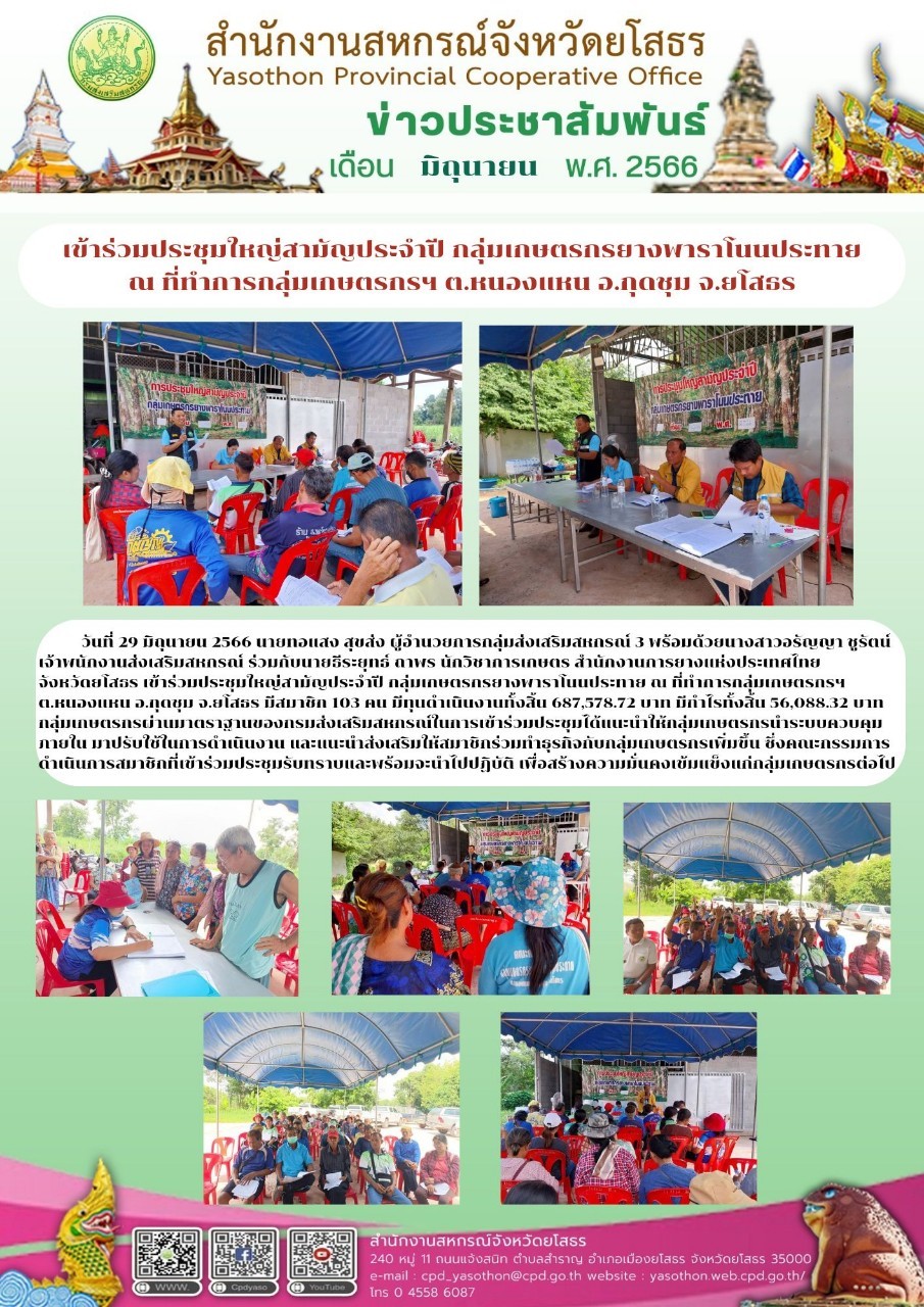 นายทอแสง สุขส่ง ผู้อำนวยกลุ่มส่งเสริมสหกรณ์ 3 พร้อมพนักงานราชการ เข้าร่วมประชุมใหญ่สมัญประจำปี กลุ่มเกษตรกรยางพาราโนนประทาย ณ ที่ทำการกลุ่มเกษตรกรยางพาราโนนประทาย