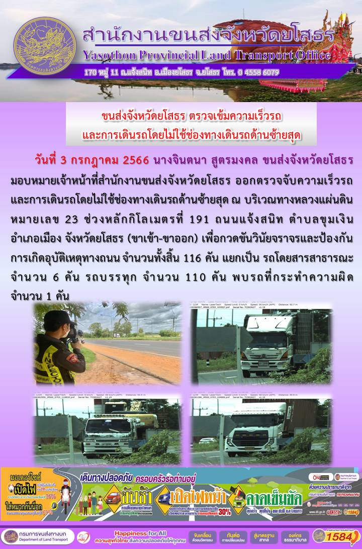 วันที่ 3 กรกฎาคม 2566 เจ้าหน้าที่สำนักงานขนส่งจังหวัดยโสธร ออกตั้งจุดตรวจจับความเร็ว