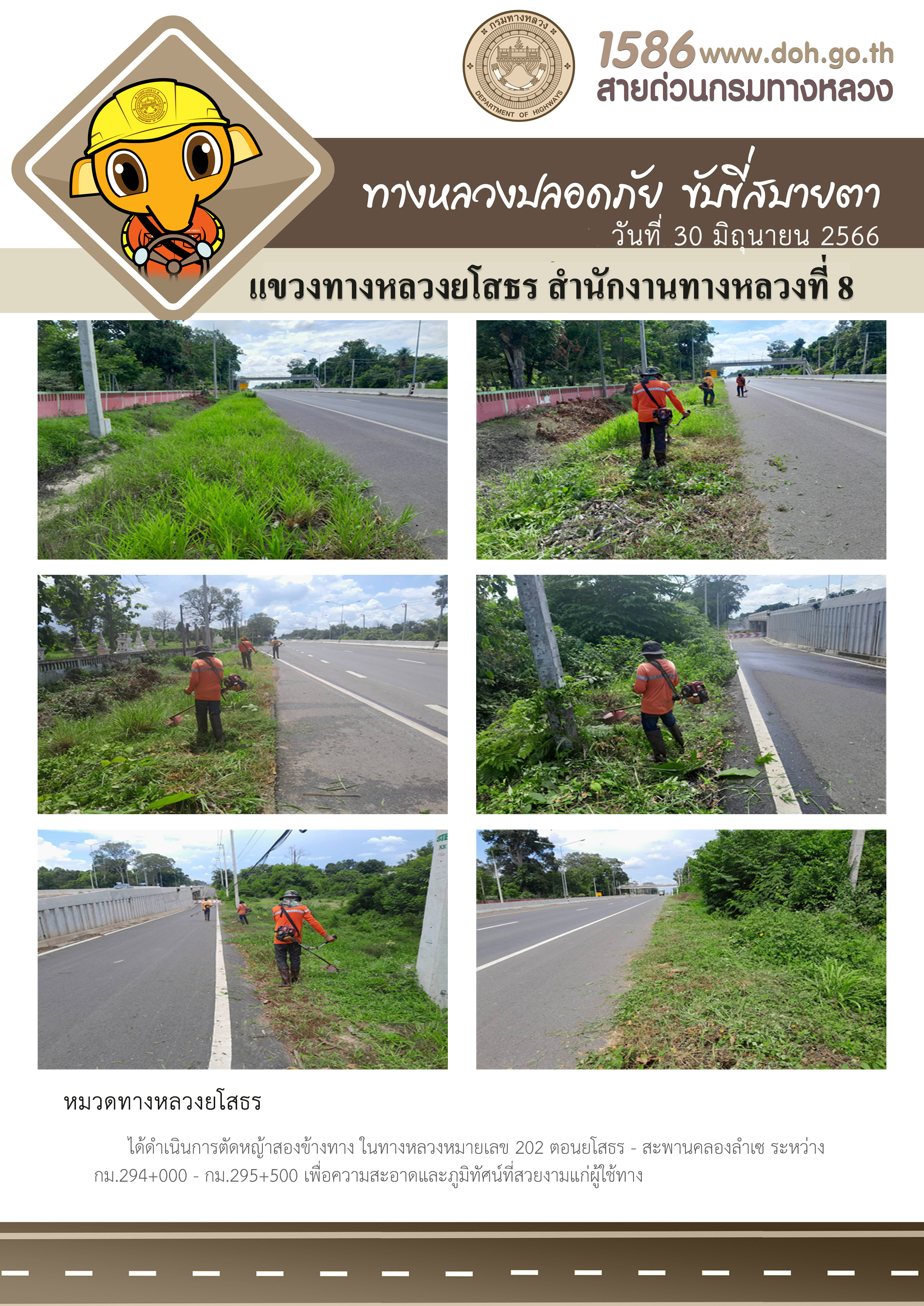 วันที่ 30 มิถุนายน 2566 หมวดทางหลวงยโสธร ได้ดำเนินการตัดหญ้าสองข้างทาง ในทางหลวงหมายเลข 202 ตอนยโสธร - สะพานคลองลำเซ ระหว่าง กม.294+000 - กม.295+500 เพื่อความสะอาดและภูมิทัศน์ที่สวยงามแก่ผู้ใช้ทาง