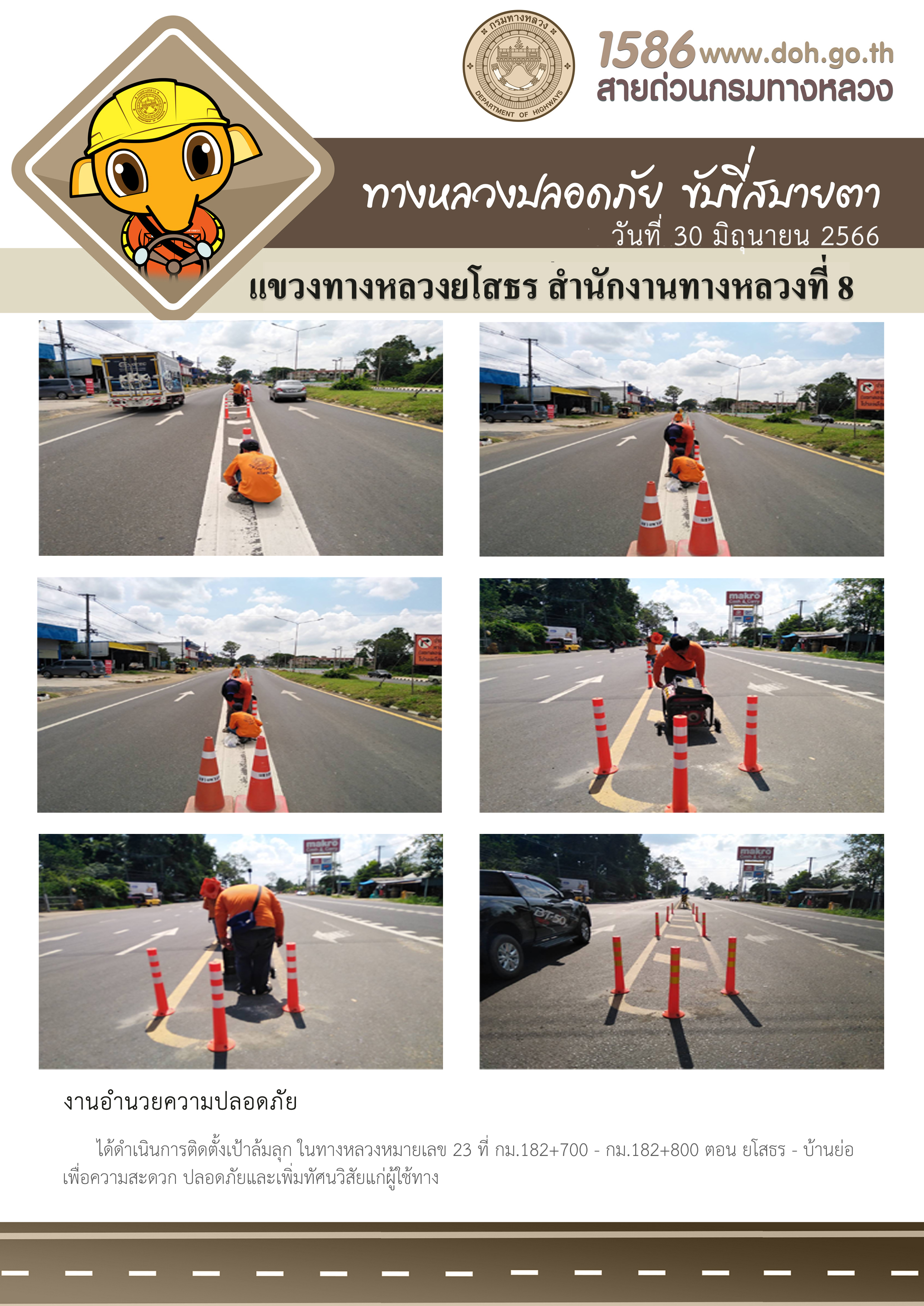 วันที่ 30 มิถุนายน 2566 งานอำนวยความปลอดภัย ได้ดำเนินการติดตั้งเป้าล้มลุก ในทางหลวงหมายเลข 23 ที่ กม.182+700 - กม.182+800 ตอน ยโสธร - บ้านย่อ เพื่อความสะดวก ปลอดภัยและเพิ่มทัศนวิสัยแก่ผู้ใช้ทาง