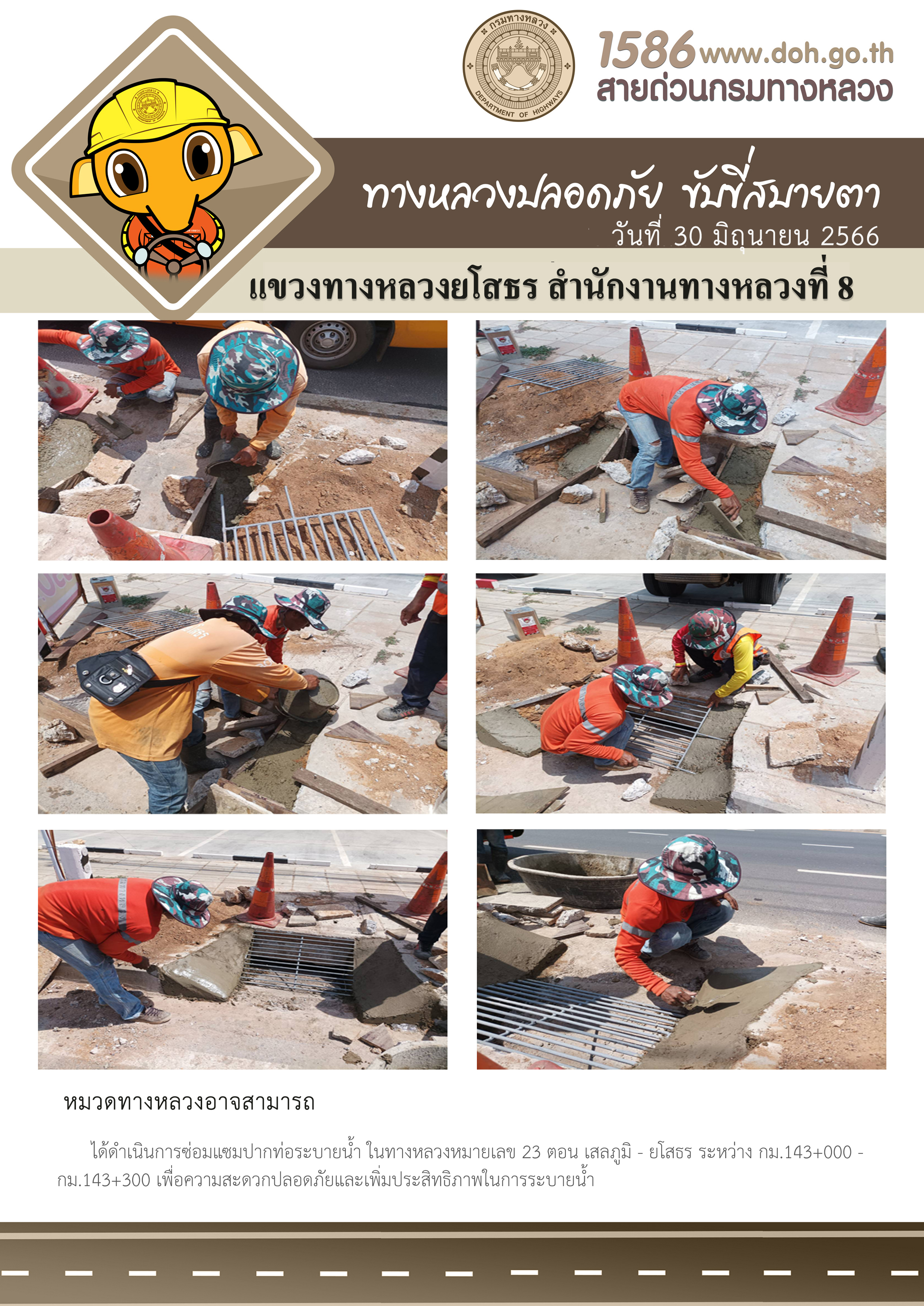 วันที่ 30 มิถุนายน 2566 หมวดทางหลวงอาจสามารถ ได้ดำเนินการซ่อมแซมปากท่อระบายน้ำ ในทางหลวงหมายเลข 23 ตอน เสลภูมิ - ยโสธร ระหว่าง กม.143+000 - กม.143+300 เพื่อความสะดวกปลอดภัยและเพิ่มประสิทธิภาพในการระบายน้ำ