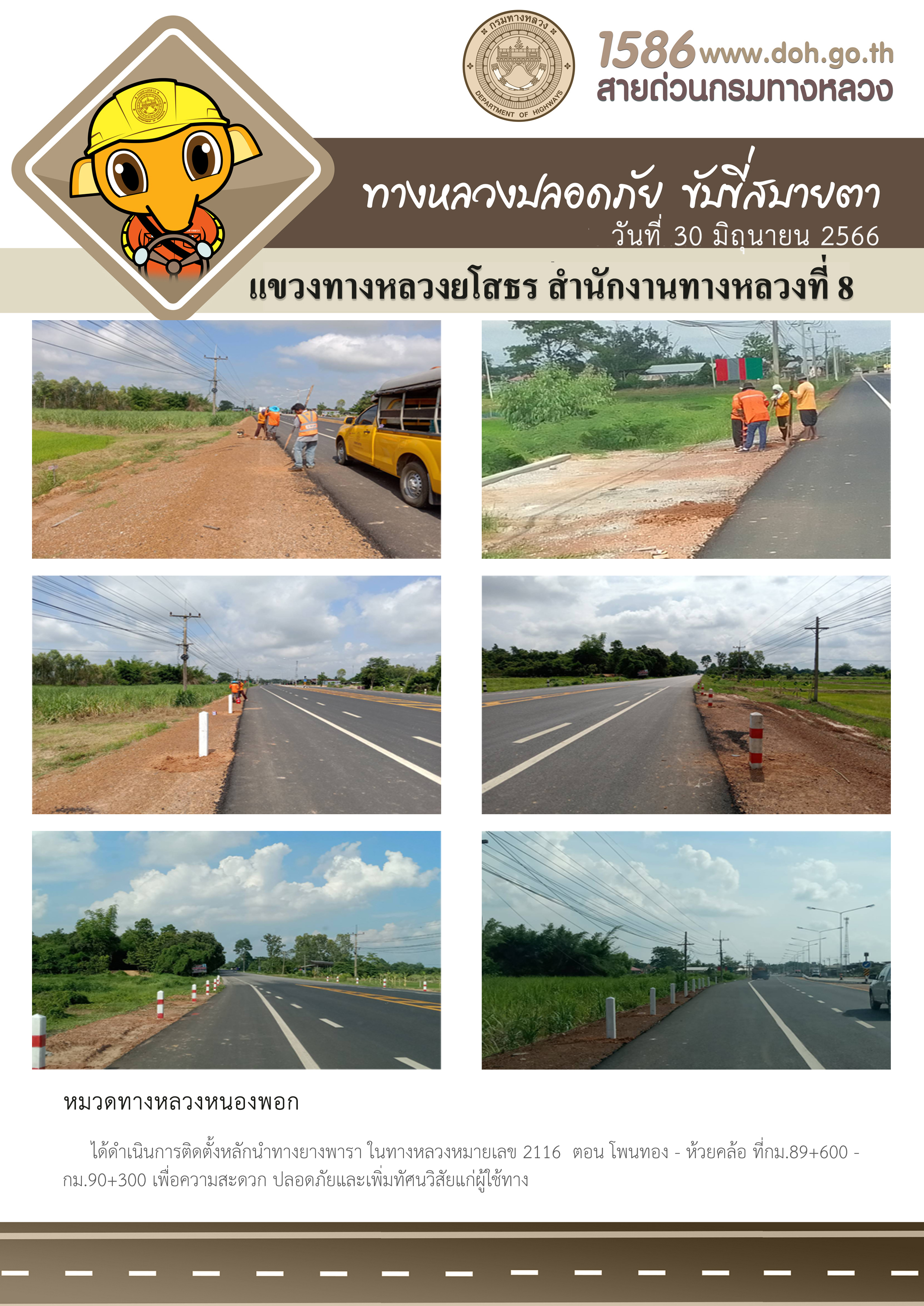 วันที่ 30 มิถุนายน 2566 หมวดทางหลวงหนองพอก ได้ดำเนินการติดตั้งหลักนำทางยางพารา ในทางหลวงหมายเลข 2116 ตอน โพนทอง - ห้วยคล้อ ที่ กม.89+600 - กม.90+300 เพื่อความสะดวก ปลอดภัยและเพิ่มทัศนวิสัยแก่ผู้ใช้ทาง