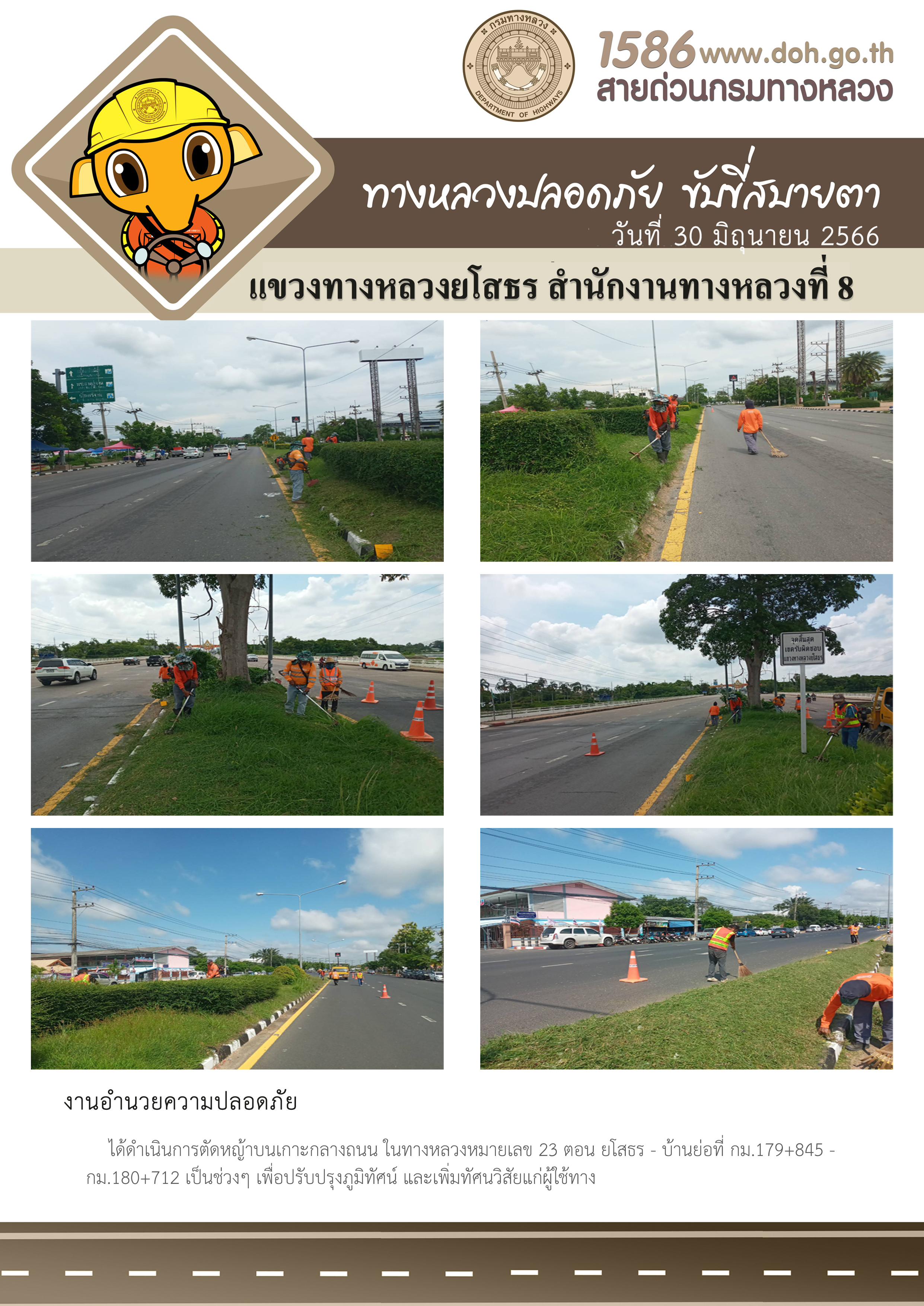 วันที่ 30 มิถุนายน 2566 งานอำนวยความปลอดภัย ได้ดำเนินการตัดหญ้าบนเกาะกลางถนน ในทางหลวงหมายเลข 23 ตอน ยโสธร - บ้านย่อ ที่ กม.179+845 - กม.180+712 เป็นช่วงๆ เพื่อปรับปรุงภูมิทัศน์ และเพิ่มทัศนวิสัยแก่ผู้ใช้ทาง