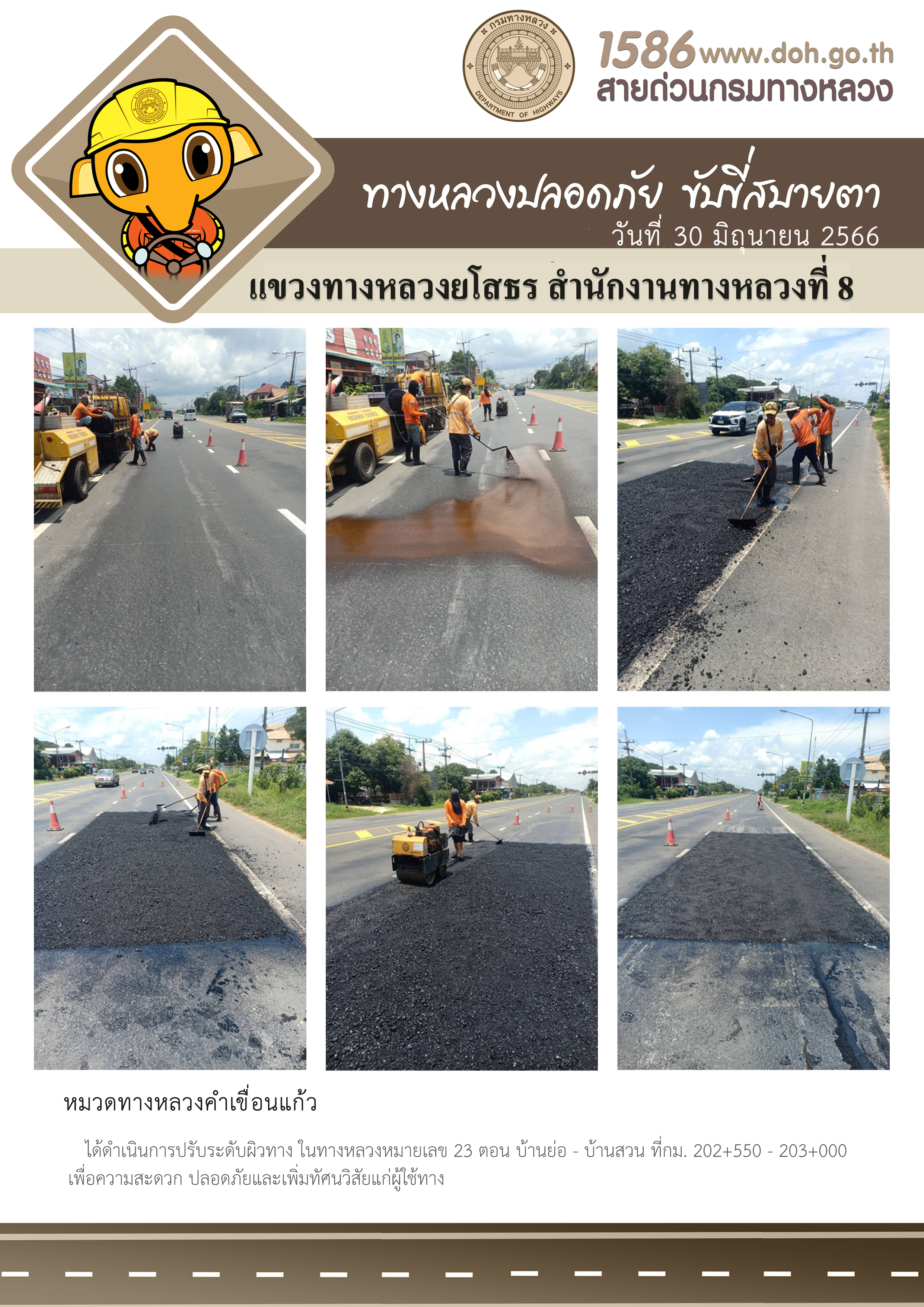 วันที่ 30 มิถุนายน 2566 หมวดทางหลวงคำเขื่อนแก้ว ได้ดำเนินการปรับระดับผิวทาง ในทางหลวงหมายเลข 23 ตอน บ้านย่อ - บ้านสวน ที่ กม.202+550 - กม.203+000 เพื่อความสะดวก ปลอดภัยและเพิ่มทัศนวิสัยแก่ผู้ใช้ทาง