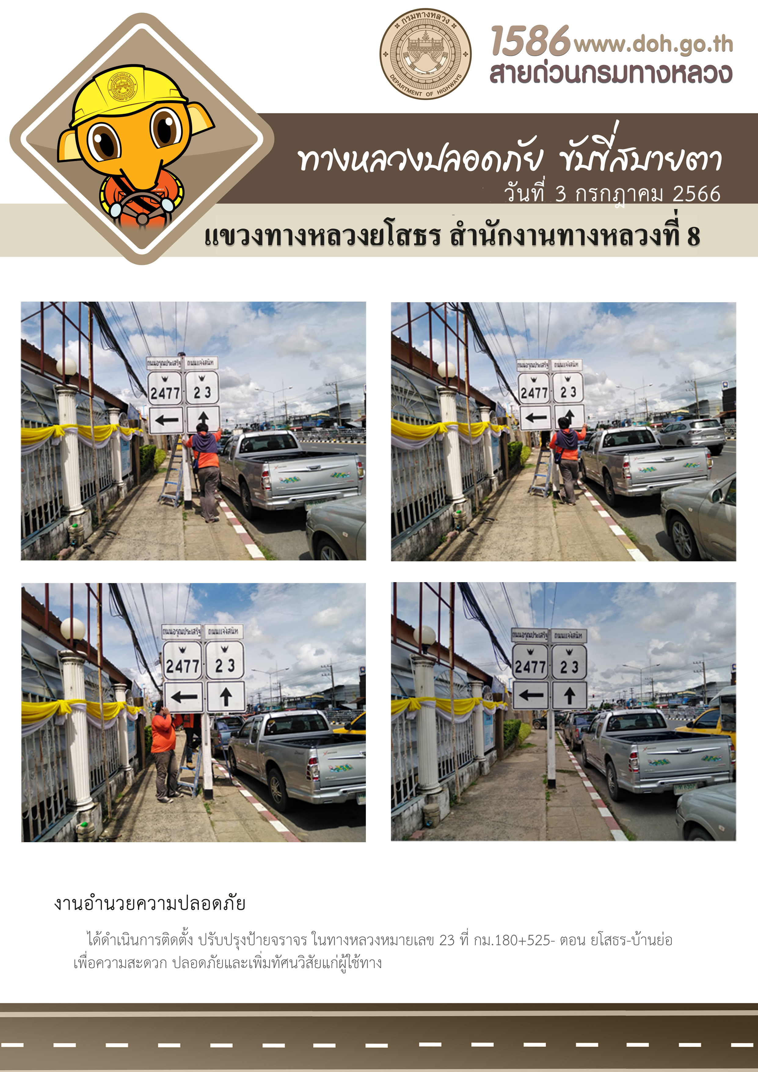 วันที่ 3 กรกฎาคม 2566 งานอำนวยความปลอดภัย ได้ดำเนินการติดตั้ง ปรับปรุงป้ายจราจร ในทางหลวงหมายเลข 23 ที่ กม.180+525 ตอน ยโสธร-บ้านย่อ เพื่อความสะดวกปลอดภัยและเพิ่มทัศนวิสัยแก่ผู้ใช้ทาง