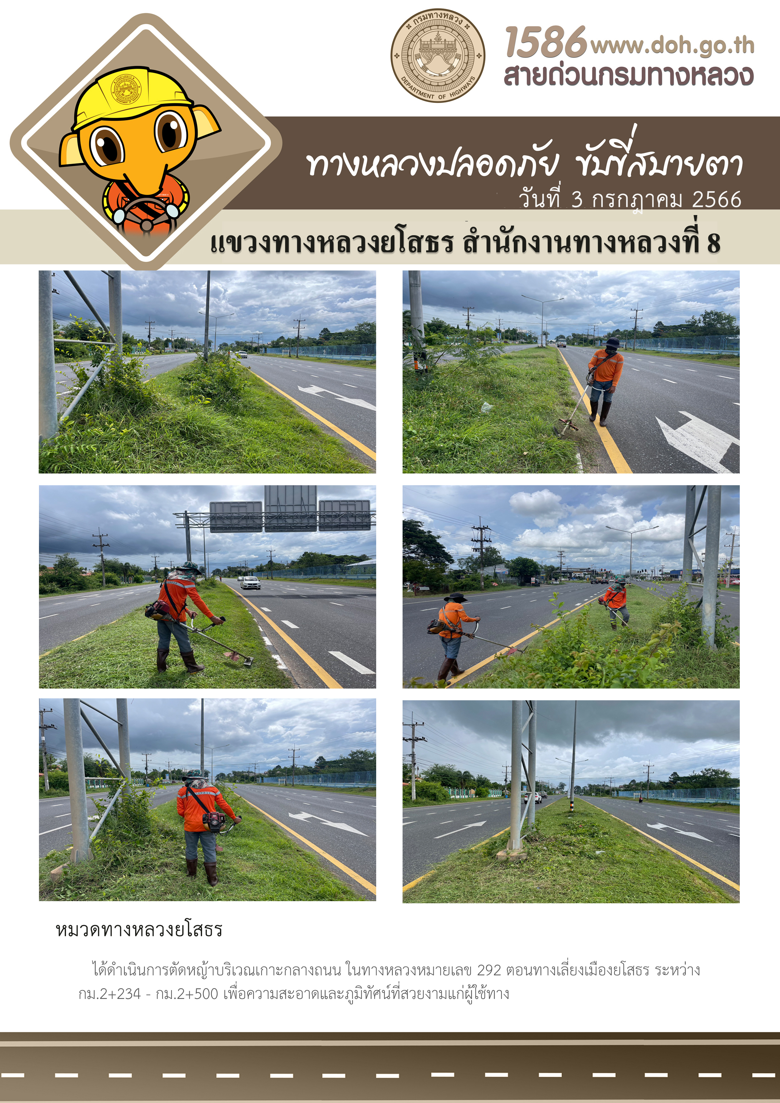 วันที่ 3 กรกฎาคม 2566 หมวดทางหลวงยโสธร ได้ดำเนินการตัดหญ้าบริเวณเกาะกลางถนน ในทางหลวงหมายเลข 292 ตอนทางเลี่ยงเมืองยโสธร ระหว่าง กม.2+234 - กม.2+500 เพื่อความสะอาดและภูมิทัศน์ที่สวยงามแก่ผู้ใช้ทาง