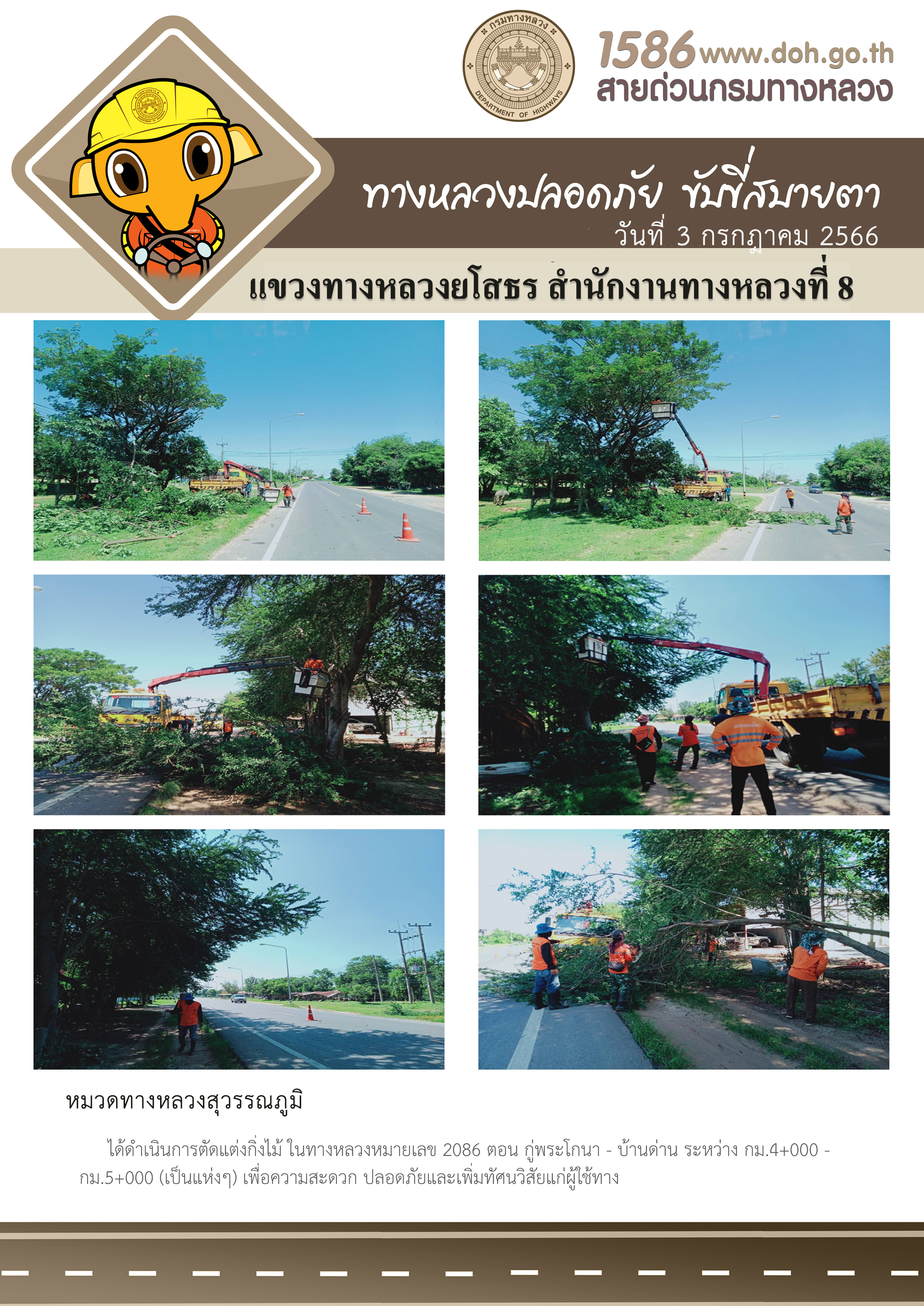 วันที่ 3 กรกฎาคม 2566 หมวดทางหลวงสุวรรณภูมิ ได้ดำเนินการตัดแต่งกิ่งไม้ ในทางหลวงหมายเลข 2086 ตอน กู่พระโกนา - บ้านด่าน ระหว่าง กม.4+000 - กม.5+000 (เป็นแห่งๆ) เพื่อความสะดวก ปลอดภัยและเพิ่มทัศนวิสัยแก่ผู้ใช้ทาง