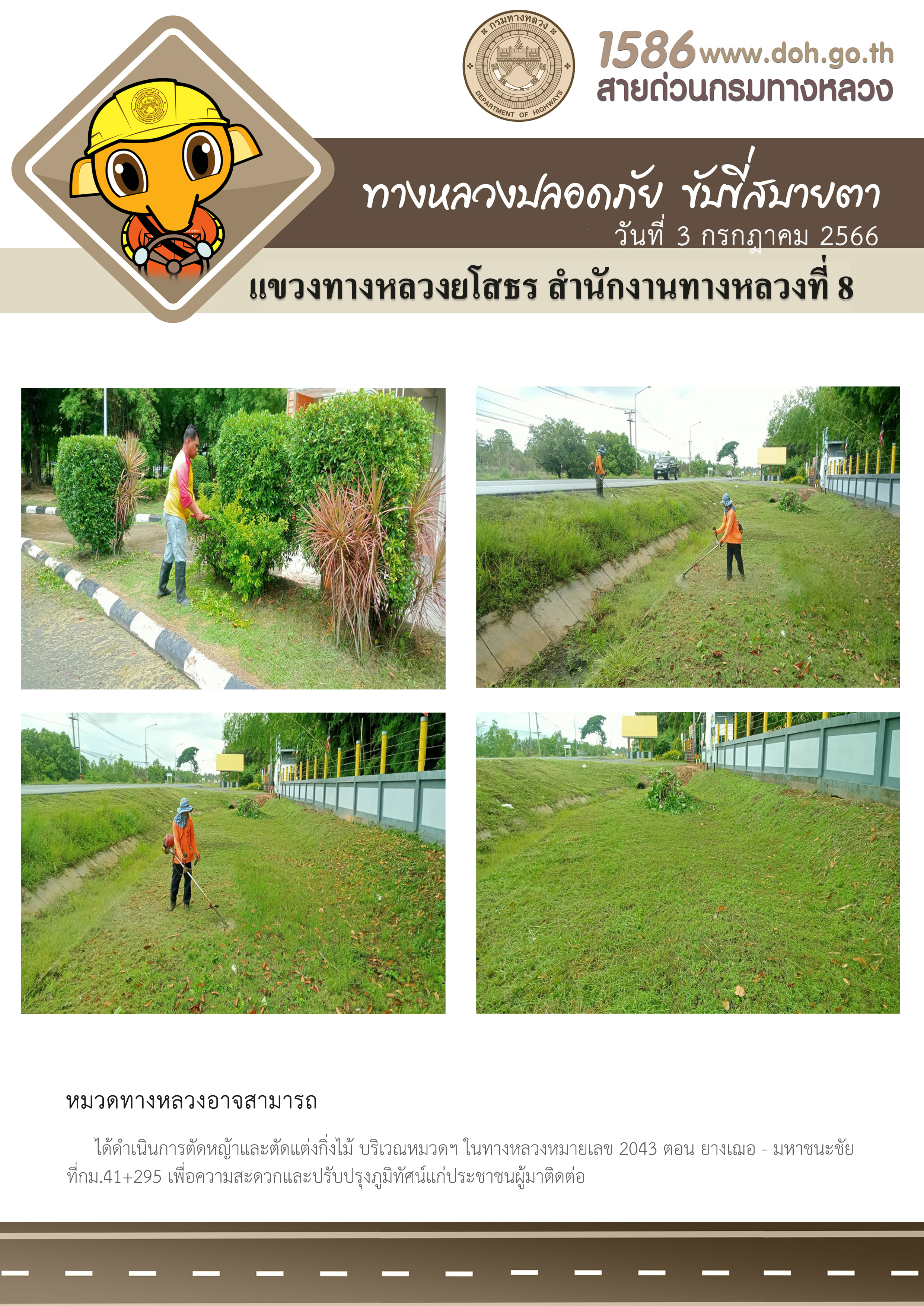 - [10:21] ทั่วไป วันอังคารที่ 31 มีนาคม 2569 งานอำนวยความปลอดภัย ได้ดำเนินการตัดหญ้า ทำความสะอาดภายในบริเวณแขวงทางหลวงยโสธร
