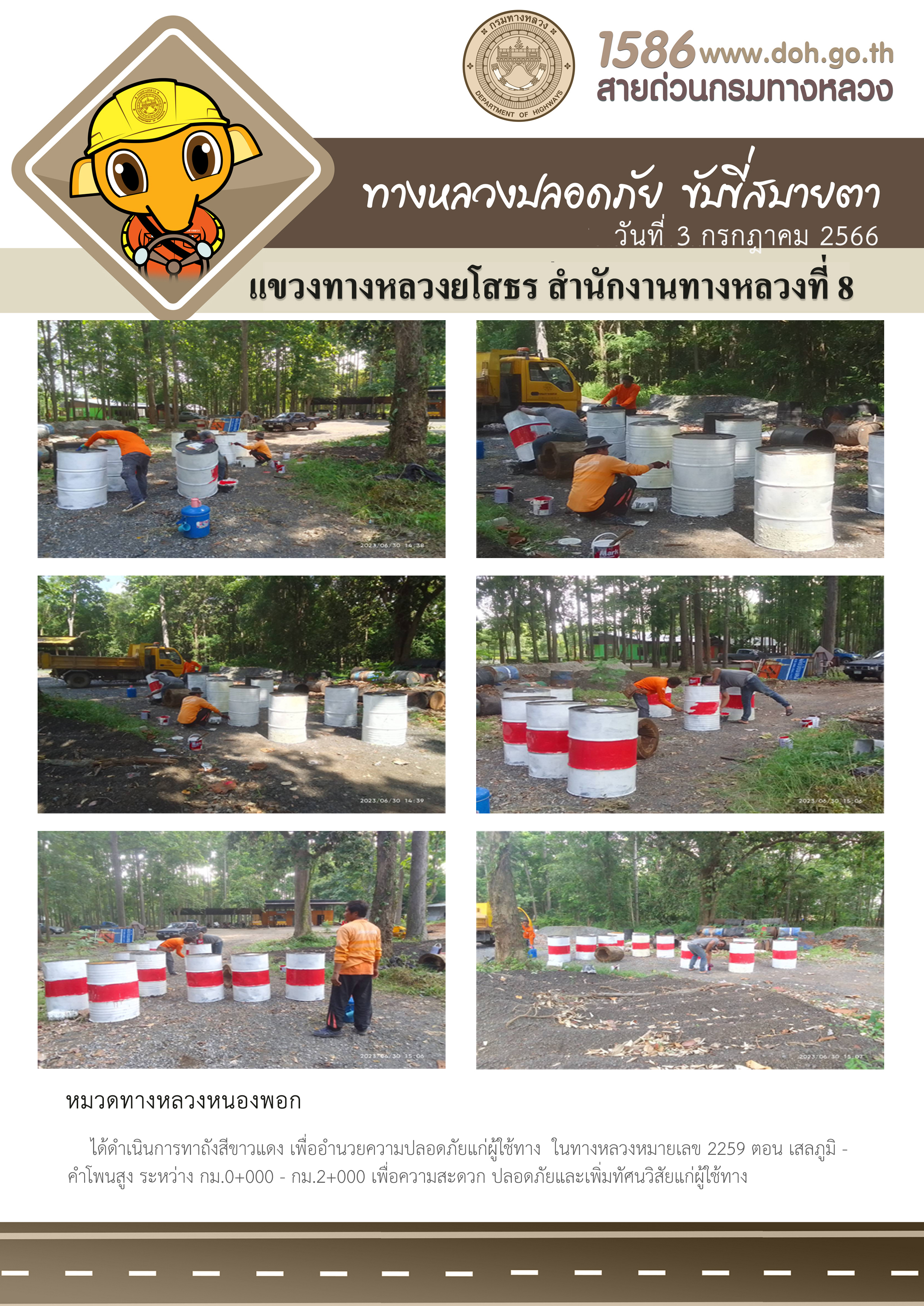 วันที่ 3 กรกฎาคม 2566 หมวดทางหลวงหนองพอก ได้ดำเนินการทาถังสีขาวแดง เพื่ออำนวยความปลอดภัยแก่ผู้ใช้ทาง ในทางหลวงหมายเลข 2259 ตอน เสลภูมิ - คำโพนสูง ระหว่าง กม.0+000 - กม.2+000 เพื่อความสะดวก ปลอดภัยและเพิ่มทัศนวิสัยแก่ผู้ใช้ทาง