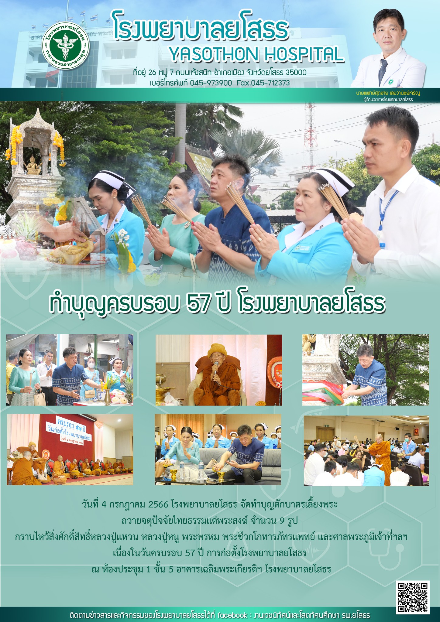 วันที่ 4 ก.ค. 2566 (14:38 น.)วันที่ 4 กรกฎาคม 2566 โรงพยาบาลยโสธร จัดทำบุญตักบาตรเลี้ยงพระ ถวายจตุปัจจัยไทยธรรมแด่พระสงฆ์ จำนวน 9 รูป กราบไหว้สิ่งศักดิ์สิทธิ์หลวงปู่แหวน หลวงปู่หนู พระพรหม พระชีวกโกทารภัทรแพทย์ และศาลพระภูมิเจ้าที่ฯลฯ เนื่องในวันครบรอบ 57 ปี การก่อตั้งโรงพยาบาลยโสธร ณ ห้องประชุม 1 ชั้น 5 อาคารเฉลิมพระเกียรติฯ โรงพยาบาลยโสธร