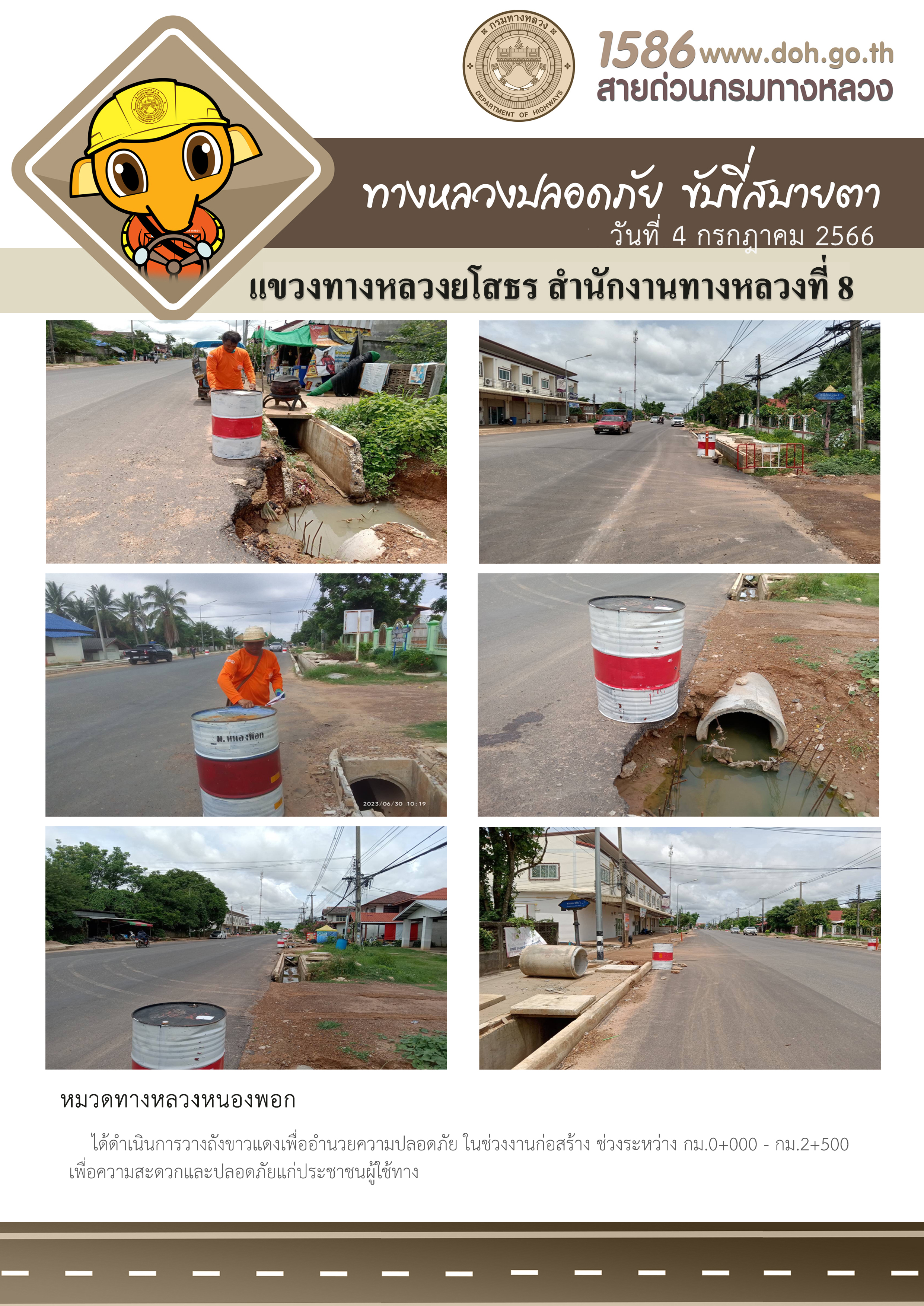 วันที่ 4 กรกฎาคม 2566 หมวดทางหลวงหนองพอก ได้ดำเนินการวางถังขาวแดงเพื่ออำนวยความปลอดภัย ในช่วงงานก่อสร้าง ช่วงระหว่าง กม.0+000 - กม.2+500 เพื่อความสะดวกและปลอดภัยแก่ประชาชนผู้ใช้ทาง