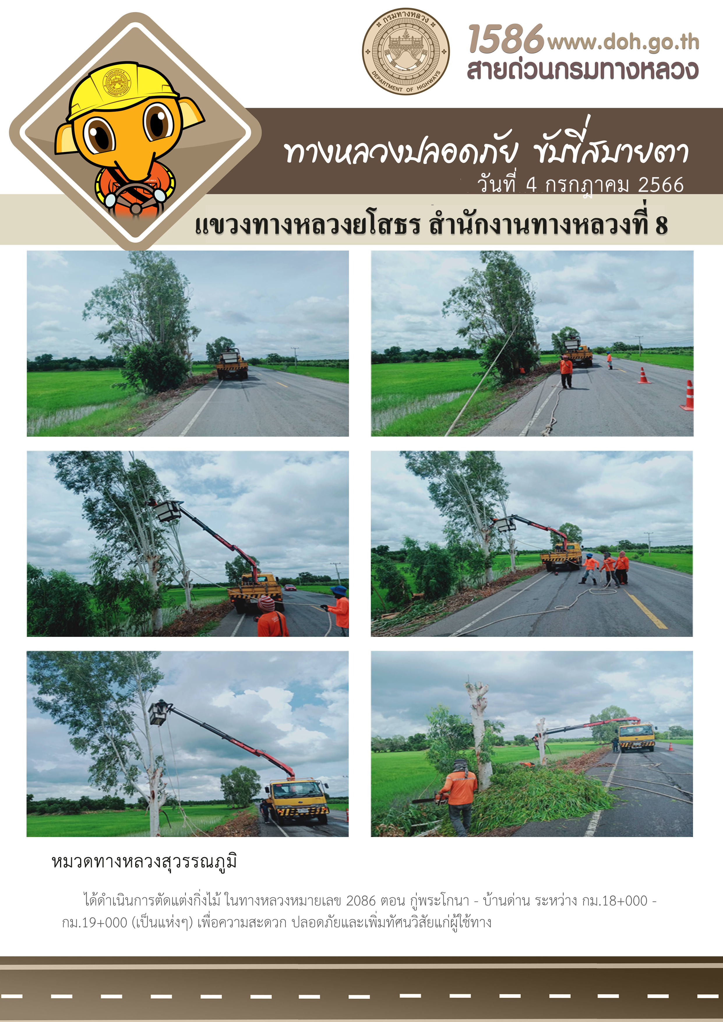 วันที่ 4 กรกฎาคม 2566 หมวดทางหลวงสุวรรณภูมิ ได้ดำเนินการตัดแต่งกิ่งไม้ ในทางหลวงหมายเลข 2086 ตอน กู่พระโกนา - บ้านด่าน ระหว่าง กม.18+000 - กม.19+000 (เป็นแห่งๆ) เพื่อความสะดวก ปลอดภัยและเพิ่มทัศนวิสัยแก่ผู้ใช้ทาง