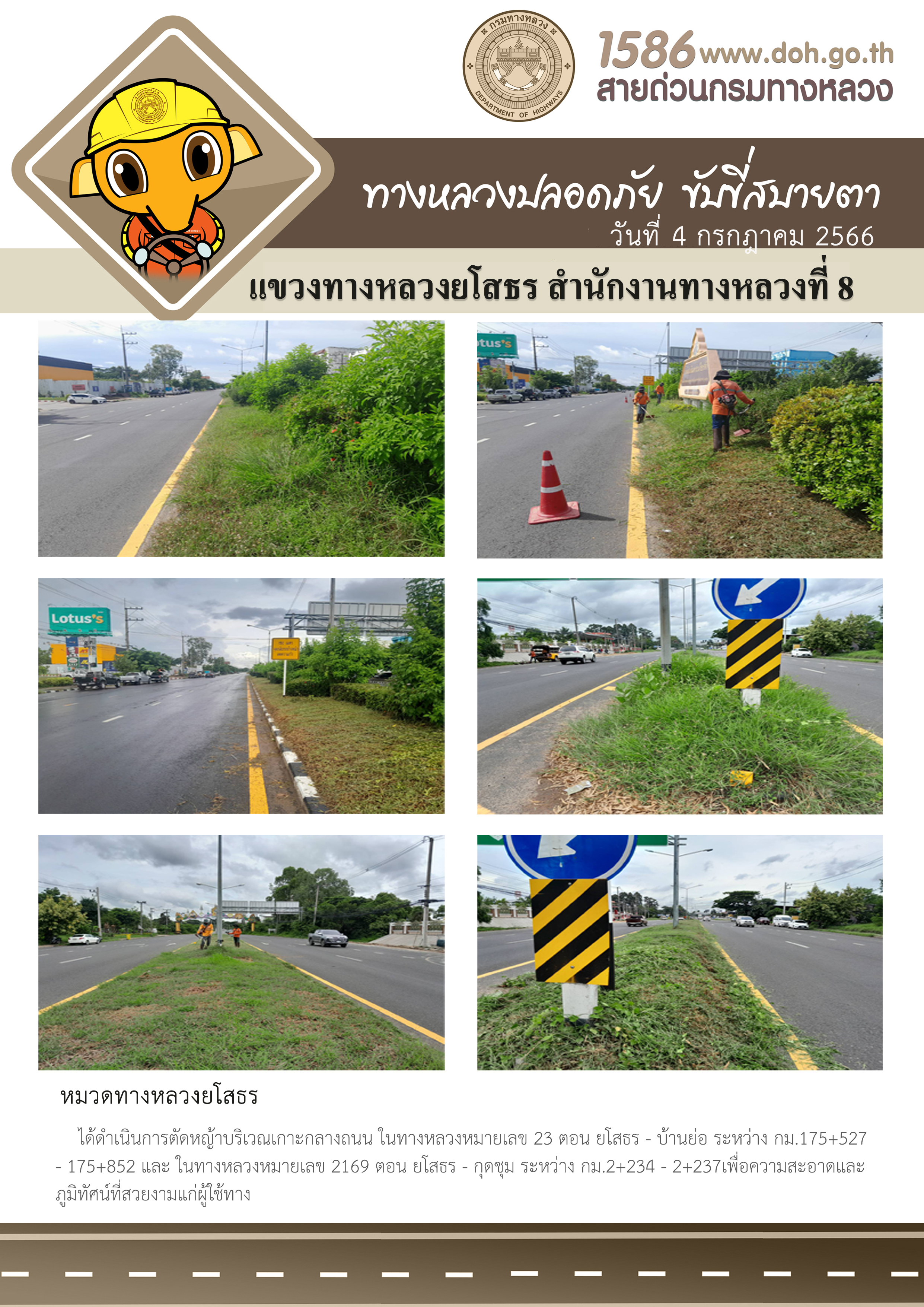 วันที่ 4 กรกฎาคม 2566 หมวดทางหลวงยโสธร ได้ดำเนินการตัดหญ้าบริเวณกาะกลางถนน ในทางหลวงหมายเลข 23 ตอน ยโสธร - บ้านย่อ ระหว่าง กม.175+527 - กม.175+852 และใน ทล.หมายเลข 2169 ตอน ยโสธร - กุดชุม ระหว่าง กม.2+234 - กม.2+237เพื่อความสะอาดและภูมิทัศน์ที่สวยงาม