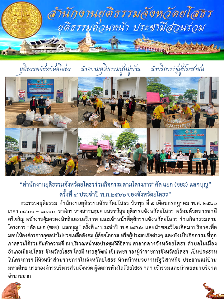 สำนักงานยุติธรรมจังหวัดยโสธรร่วมกิจกรรมตามโครงการ“คัด แยก (ขยะ) แลกบุญ” ครั้งที่ 4 ประจำปี พ.ศ.2566 ของจังหวัดยโสธร