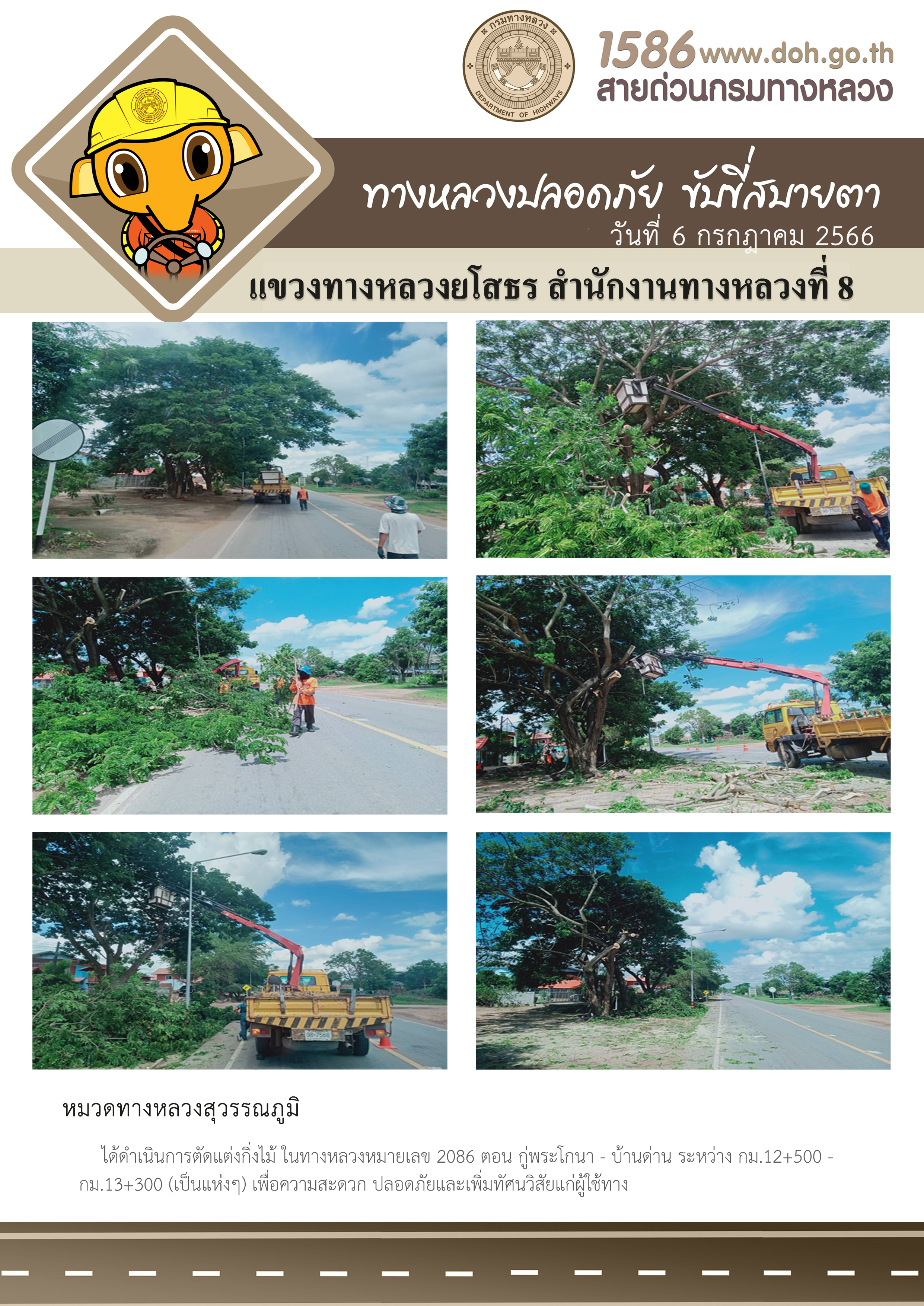 วันที่ 6 กรกฎาคม 2566 หมวดทางหลวงสุวรรณภูมิ ได้ดำเนินการตัดแต่งกิ่งไม้ ในทางหลวงหมายเลข 2086 ตอน กู่พระโกนา - บ้านด่าน ระหว่าง กม.12+500 - กม.13+300 (เป็นแห่งๆ) เพื่อความสะดวก ปลอดภัยและเพิ่มทัศนวิสัยแก่ผู้ใช้ทาง